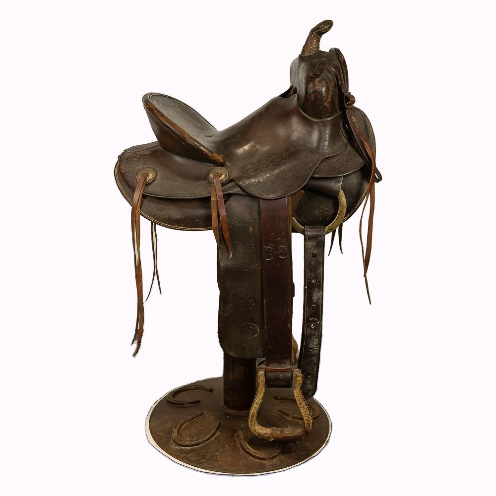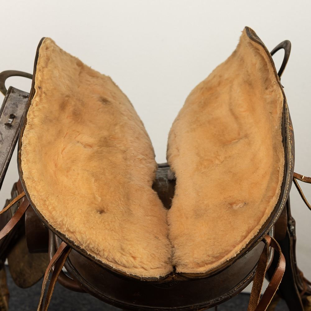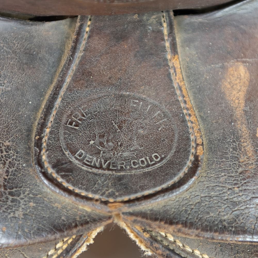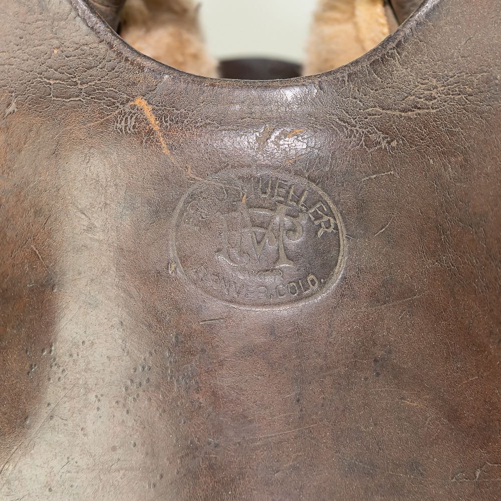 OVERSIZED ITEM - CANNOT SHIP! 3RD PARTY TRANSPORT OR LOCAL PICK UP ONLY! Nice Fred Mueller leather saddle. Makers name "Fred Mueller" embossed on seat front and behind seat. Fenders marked "Tipton Bronco Busting Saddle" and "B-S" initials. The stirrups are covered with rawhide with leather lace. The fleece is in good condition. Seat measures approx 14". Horn 3.75" Condition good. Leather can use some conditioning. Minor scratches. Nice example. **History: Fred Mueller was born in the mid 1860s in St. Louis, Missouri. He opened a saddle shop in Denver, Colorado in 1891 and died in 1924. Fred sold his business in 1917. The shop continued until 1957.
