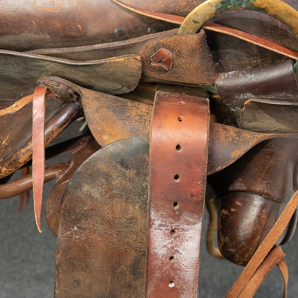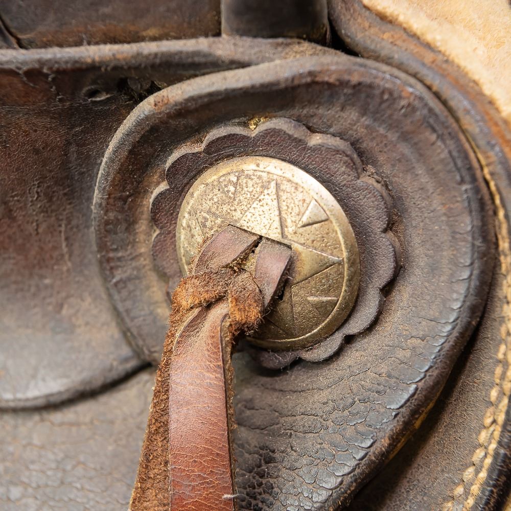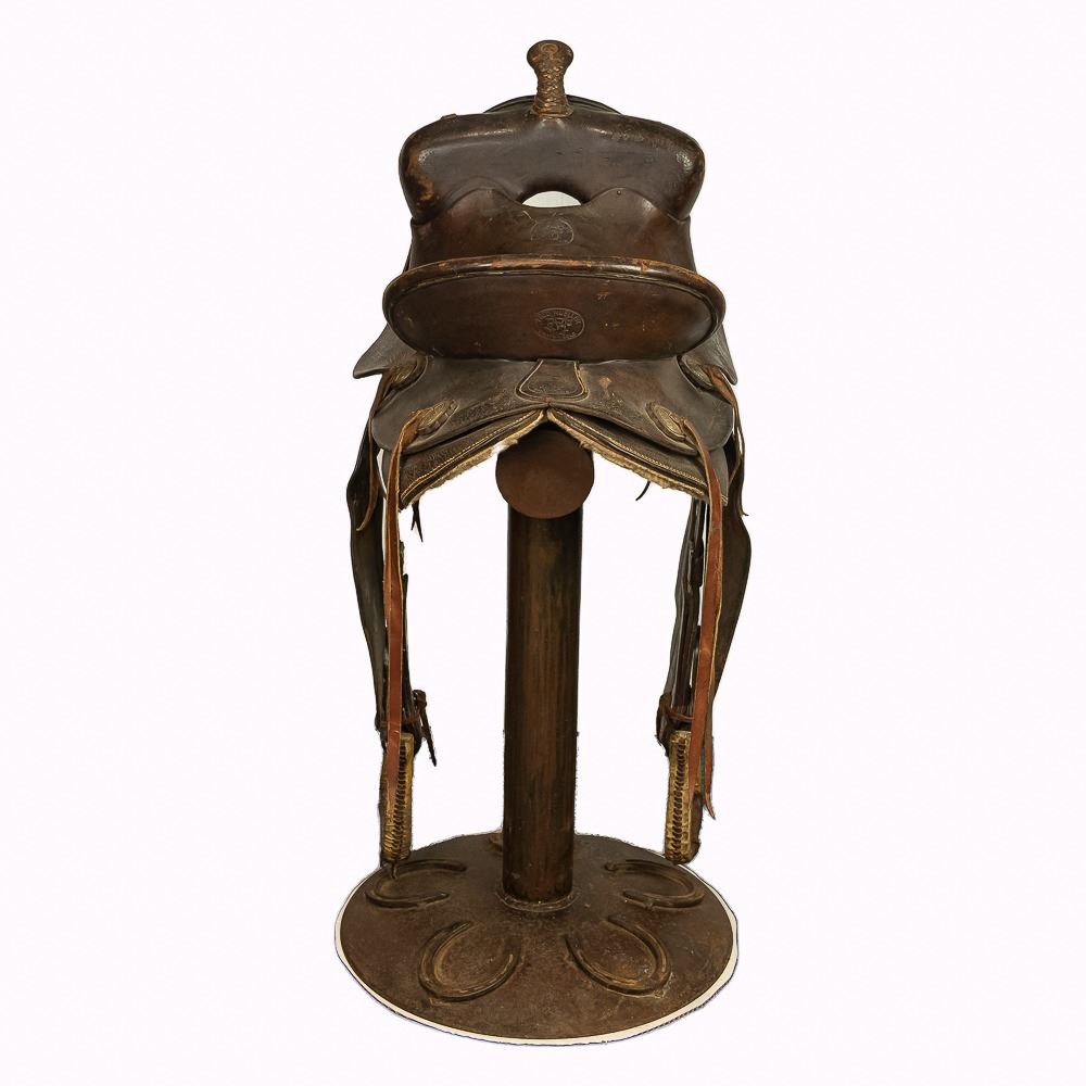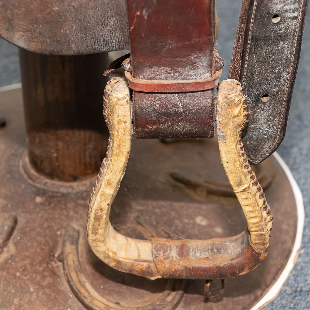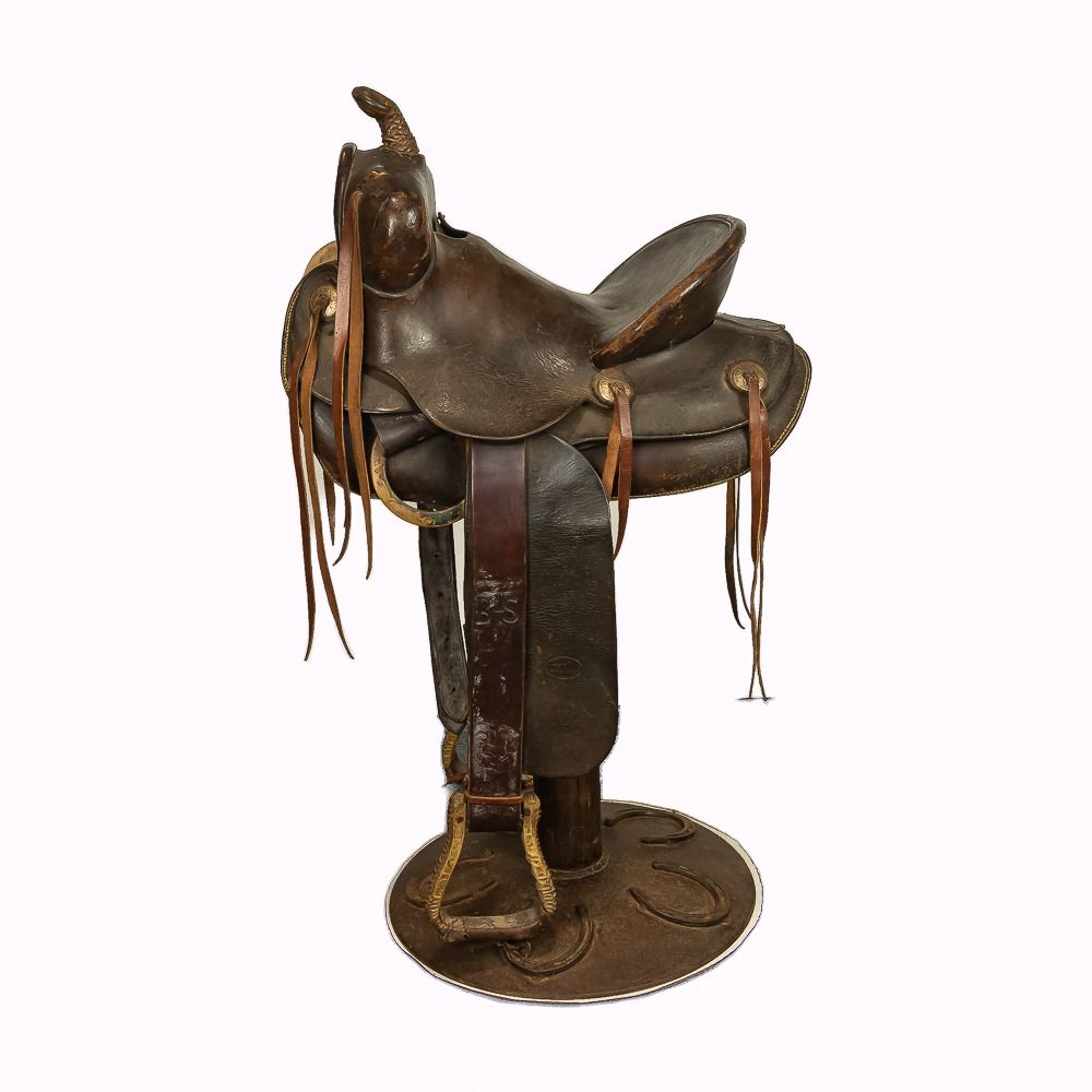 OVERSIZED ITEM - CANNOT SHIP! 3RD PARTY TRANSPORT OR LOCAL PICK UP ONLY! Nice Fred Mueller leather saddle. Makers name "Fred Mueller" embossed on seat front and behind seat. Fenders marked "Tipton Bronco Busting Saddle" and "B-S" initials. The stirrups are covered with rawhide with leather lace. The fleece is in good condition. Seat measures approx 14". Horn 3.75" Condition good. Leather can use some conditioning. Minor scratches. Nice example. **History: Fred Mueller was born in the mid 1860s in St. Louis, Missouri. He opened a saddle shop in Denver, Colorado in 1891 and died in 1924. Fred sold his business in 1917. The shop continued until 1957.