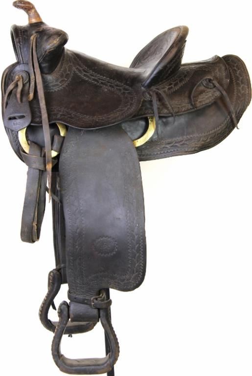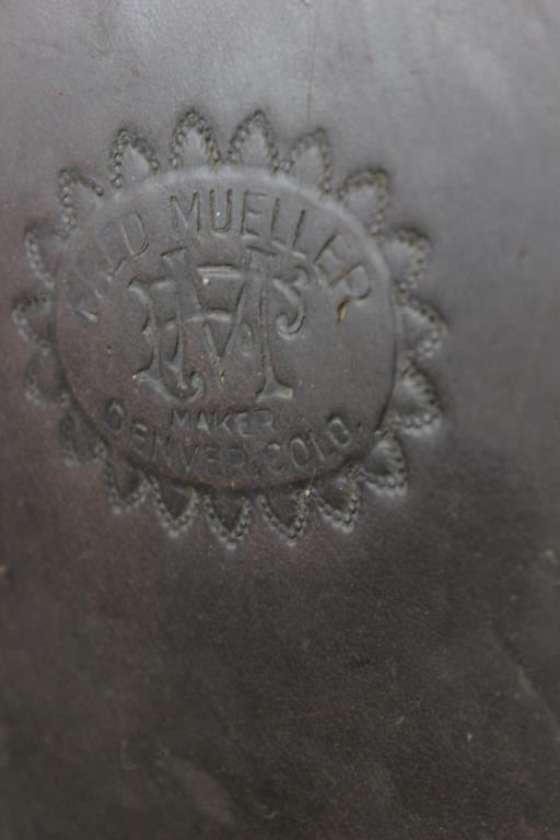 Fred Mueller square skirt saddle, 13" seat, 15" swells on bear trap style tree, 4" cantle and 2" horn. Good overall condition, leather soft and supple, some rope burns on the tree, stamped in 4 places. Original lining intact. 13" seat, 15" swells on bear trap style tree, 4" cantle and 2" horn. Good overall condition, leather soft and supple, some rope burns on the tree, stamped in 4 places. Original lining intact.