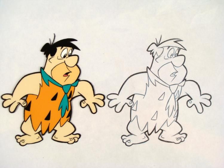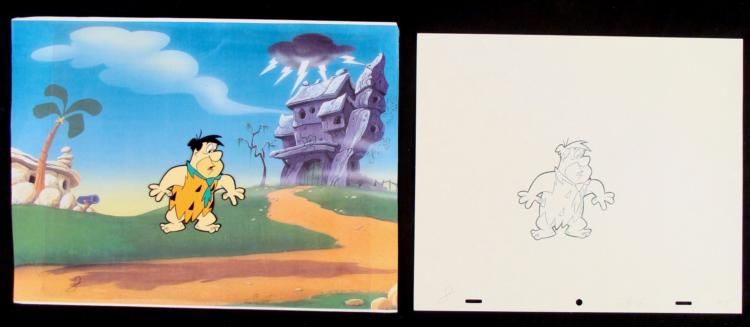 Uh-oh, this can not be good... The cel comes with a matching drawing overlay. * * Original Production Art Cel, Drawing, and Reproduction Background Original "rough" animation drawing, with notations in black and non-photo blue. Fred has been outlined in black and non-photo blue. * Overall Size of the Cel: 10 1/2" x 12 1/2" Overall Size of Reproduction Background: 11" x 13 1/4" * Excellent condition This is an original hand-painted cel set-up used in the production of an episode of "The Flintstones." Each one-of-a-kind set-up represents a slight change in position of the characters. When individually photographed and projected in rapid succession, the images appear to move. * To create production cels, the original animator's drawing is transferred onto an acetate cel (by hand-inking and/or photo copying). The cel is then hand-painted on the reverse side. The background accompanying this set-up is a reproduction background. * * The cel, drawing, and background are ready to be matted and framed. The animator's notations are shown at the bottom of the cel and drawing. There is some very minor creasing to the right corner of the background. *