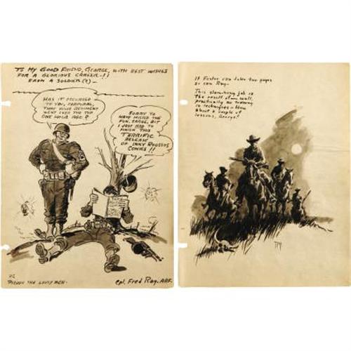 <B>Fred Ray - George Roussos Sketchbook Illustration Original Art, Group of 2 (circa 1942).</B></I> Golden Age great Fred Ray contributed these two top-notch illustrations to the George Roussos sketchbook, Each page has an overall size of 9" x 11.75", and the art averages Very Good condition.<BR><BR><b>Shipping:</b> Flat Material, Small (<a target="_blank" href="http://www.heritageauctions.com/common/shipping.php">view shipping information</a>)