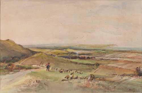 Fred Rider watercolour, Shepherd and flock in an open landscape, signed, 8 x 12 ins. £80-100