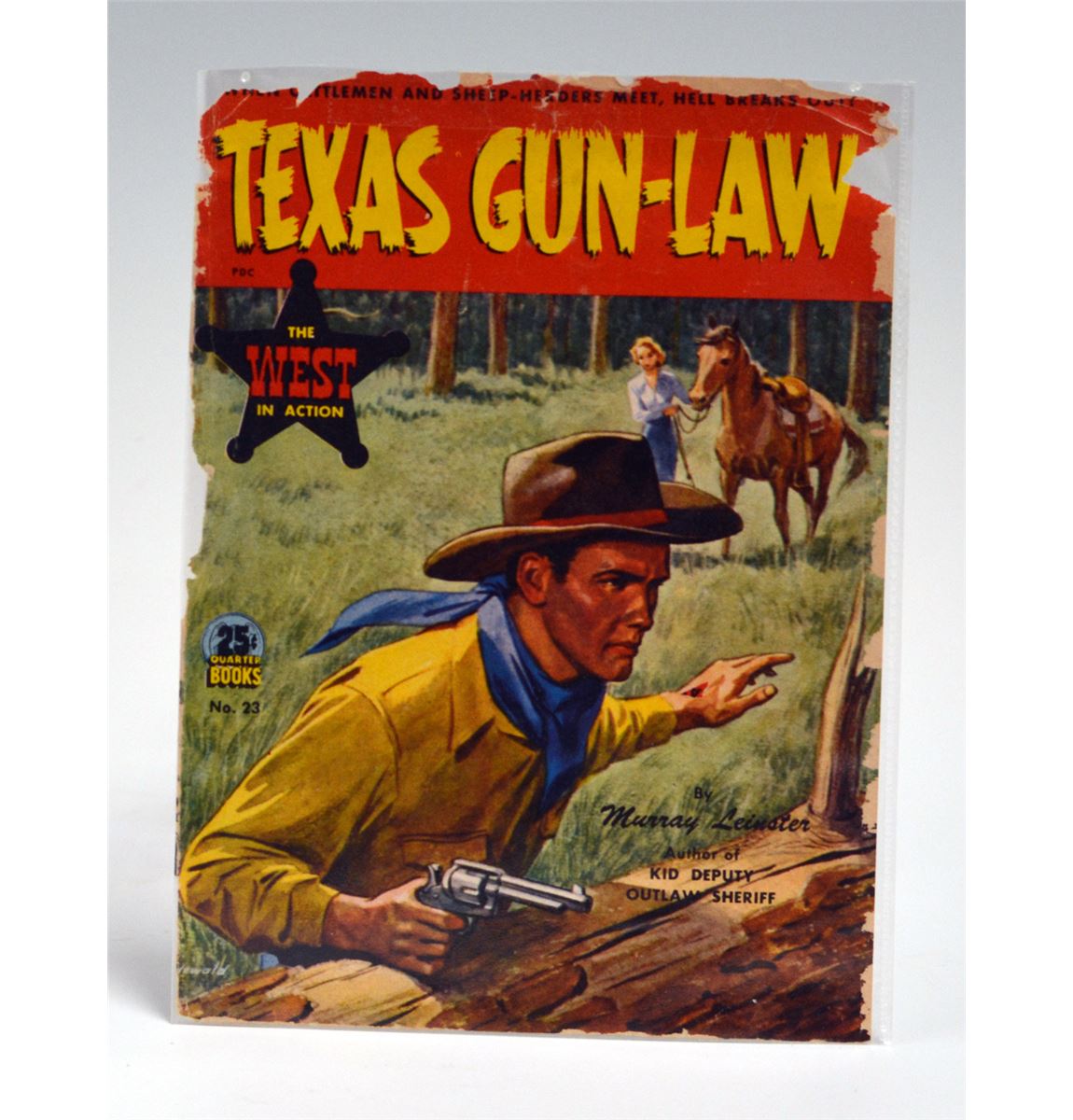 Illustration for the cover of "Texas Gun-Law" - "When Cattleman and Sheep-Herders Meet, Hell Breaks Out" by Murray Leinster, Quarter Books, #23, 1949. Cover of the book included.