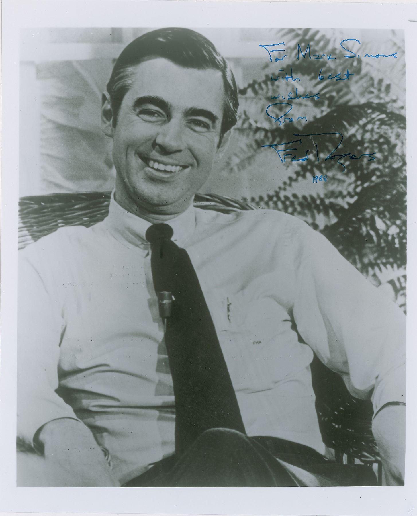 Glossy 8 x 10 photo of the beloved children's television host, signed and inscribed in blue felt tip, "For Mark Simons, with best wishes from Fred Rogers, 1988.” In very fine condition, with poor signature contrast.