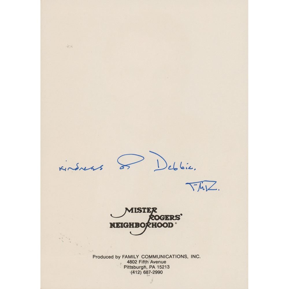Color semi-glossy 5 x 7 Mister Rogers' Neighborhood promotional photo of the show's benevolent host, signed and inscribed in felt tip, "For Burt Penn, with kindest regards and gratitude, Fred Rogers, 1995," who adds a handwritten note on the back, "Kindness of Debbie, FMR." The front bears a preprinted "Mister Rogers" autograph. In fine condition.