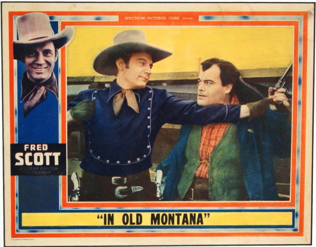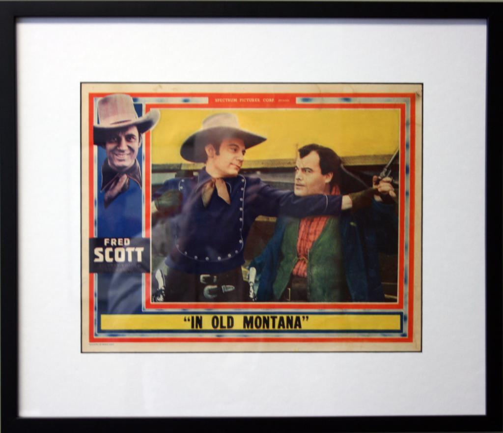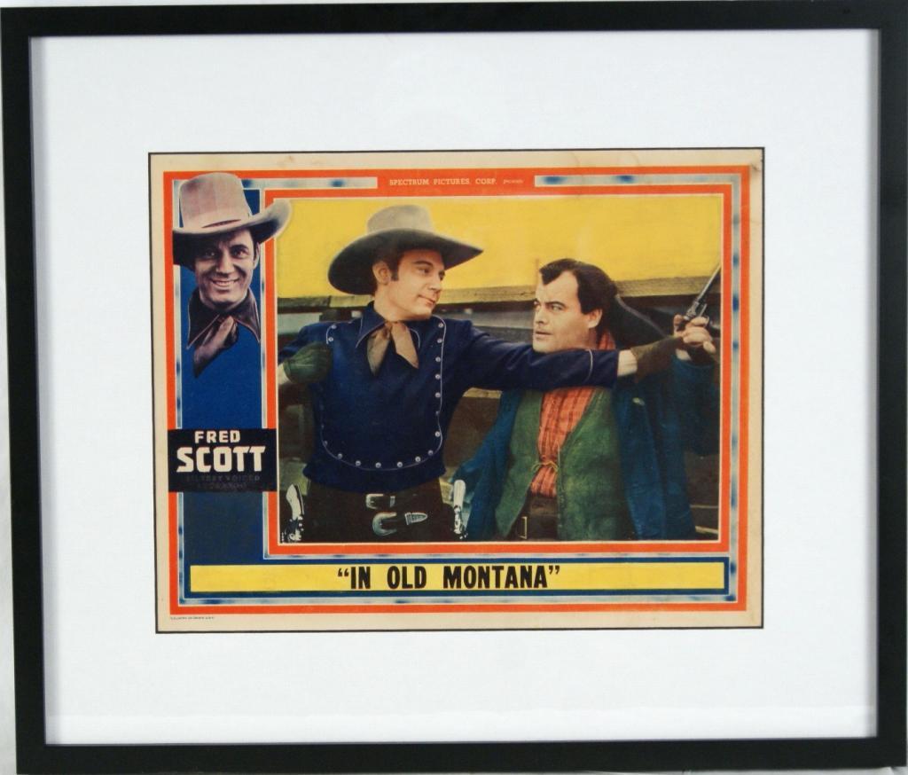 Fred Scott 'In Old Montana' 1939 Lobby Card.  Very Good - Excellent Condition - Nearly Flawless.  Professionally Framed with UV Glass.  Linen backed.  Museum Quality Vintage Poster.  Outstanding Vintage Color remains.