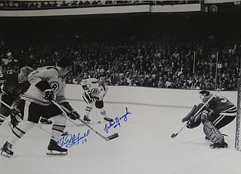 Johnny Bucyk was a hockey left winger and member of the Hockey Hall of Fame. Having played most of his career with the Boston Bruins, he has been associated in one capacity or another with the Bruins' organization since the late 1950s. When the Bruins became a powerhouse in the late Sixties Bucyk proved particularly effective playing on the left side on Boston's greatly feared power play unit, which featured Phil Esposito and Fred Stanfield. Fred Stanfield played 14 seasons in the National Hockey League from 1964 until 1978. He won two Stanley Cups with the Boston Bruins, in 1970 and 1972. Johnny Bucyk and Fred Stanfield have both signed this Boston Bruins 16x20 Photo. Certificate of Authenticity from Athlon Sports Collectibles.