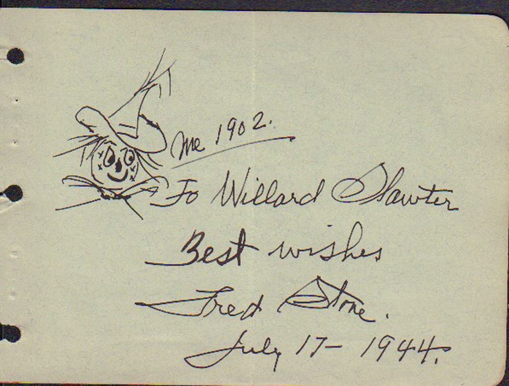 Autograph book page signed by Fred Stone. It is inscribed to Willard Slawter and includes a sketch of a scarecrow and the note Me 1902. The page had at some point been folded in half. All items come with a certificate of authenticity good for the life of the piece.