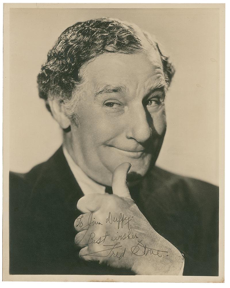 Actor (1873-1959) who played the Scarecrow in The Wizard of Oz play that premiered in 1902. Vintage sepia matte-finish 8 x 10 photo, signed and inscribed in fountain pen “To Jim Duffy, Best wishes, Fred Stone.” Photo is affixed to an identical size board. In fine condition.