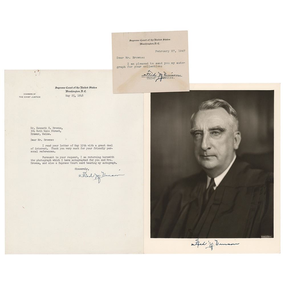 Three items signed by Vinson: a fabulous vintage matte-finish 7.75 x 9.75 portrait of Vinson in his robes by Harris & Ewing, signed in the lower border in fountain pen, "Fred M. Vinson," with a collector's label on the reverse dating it to 1948; a TLS on Supreme Court letterhead, May 25, 1948, in part: "I am returning herewith the photograph which I have autographed"; and a TNS on a Supreme Court card, February 27, 1947, in part: "I am pleased to send you my autograph for your collection." In fine condition, with two tiny surface impressions above Vinson's head, and some light creasing and toning to the letters. Accompanied by the original mailing envelope for the signed card and an unsigned matte-finish Harris & Ewing photo of Vinson and his wife.