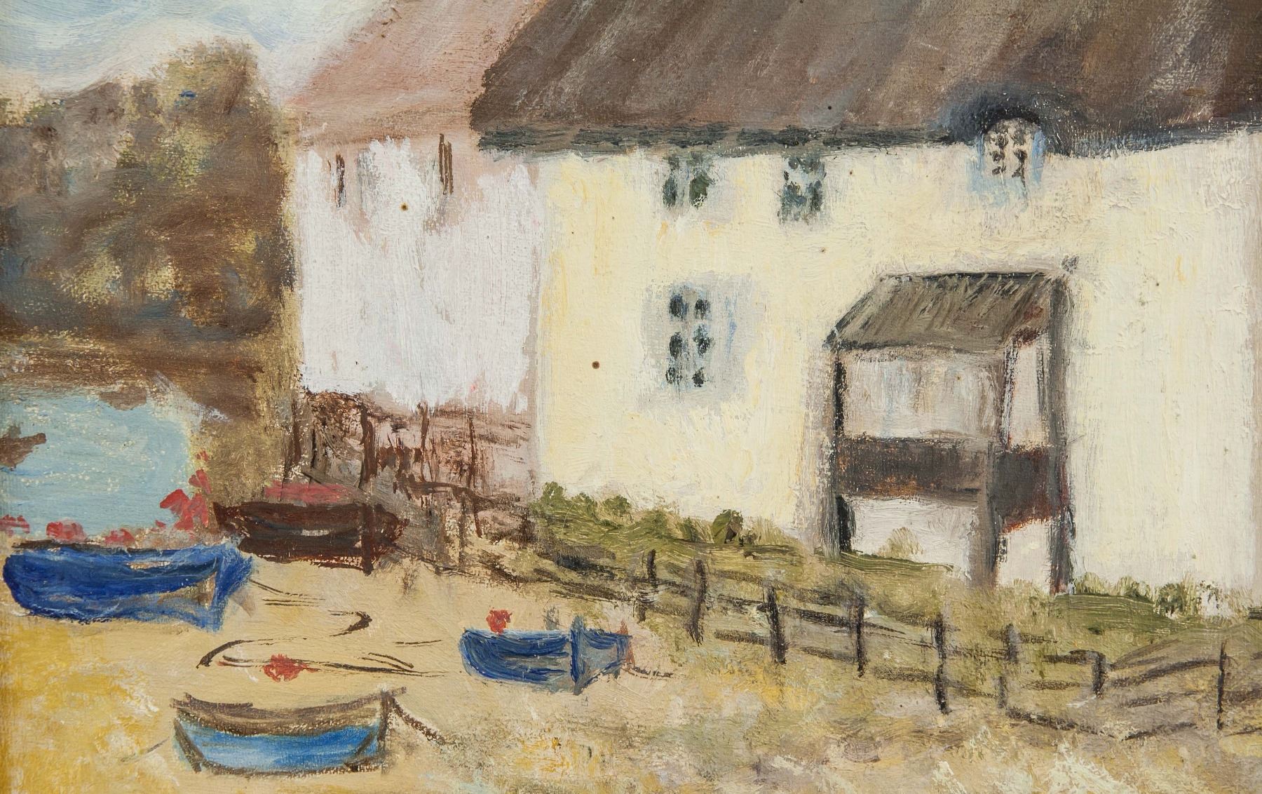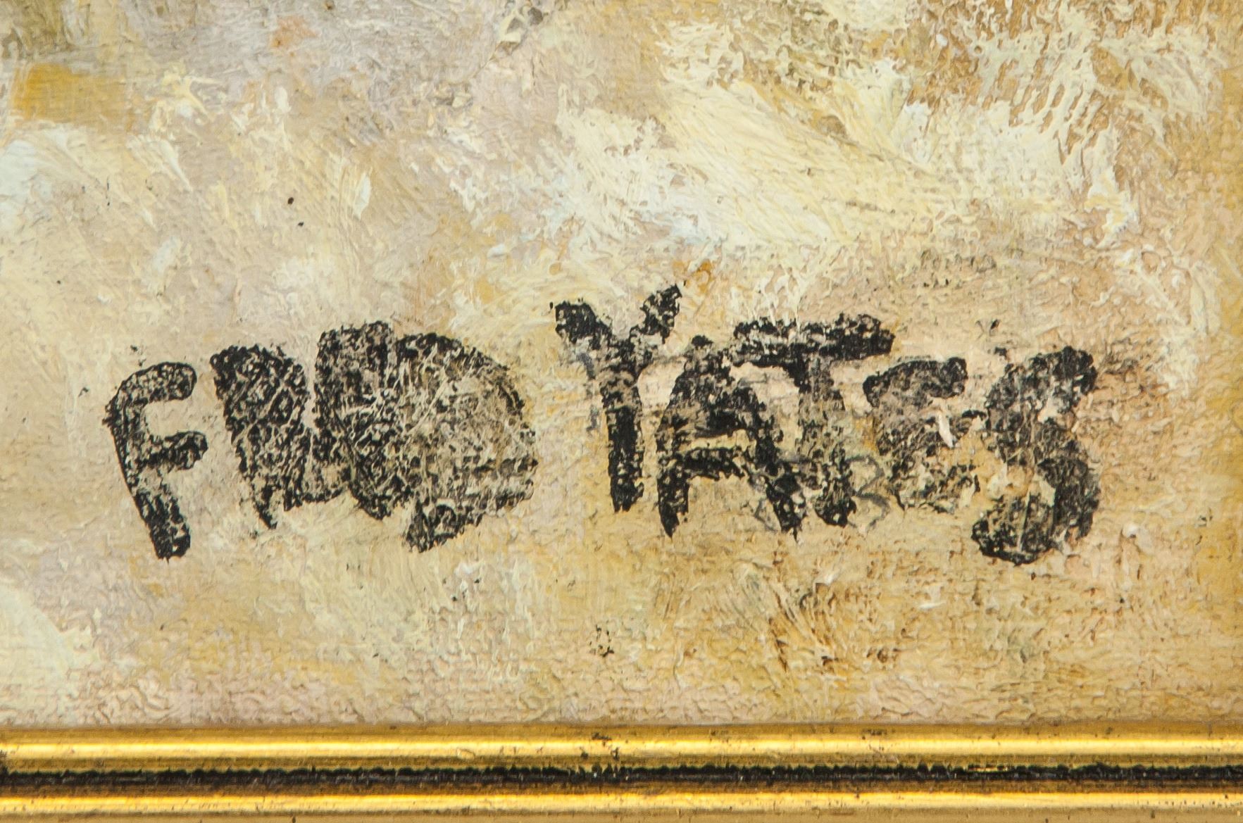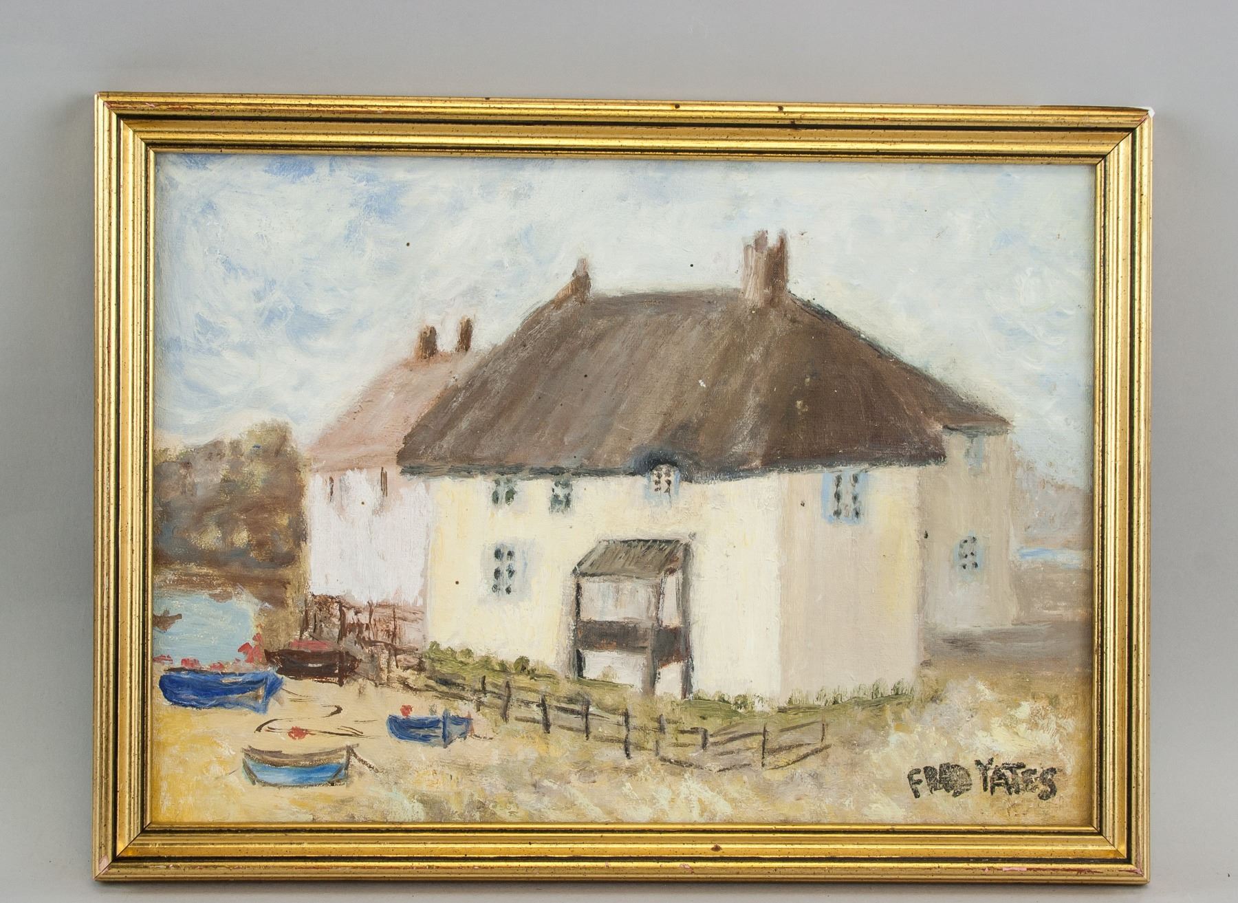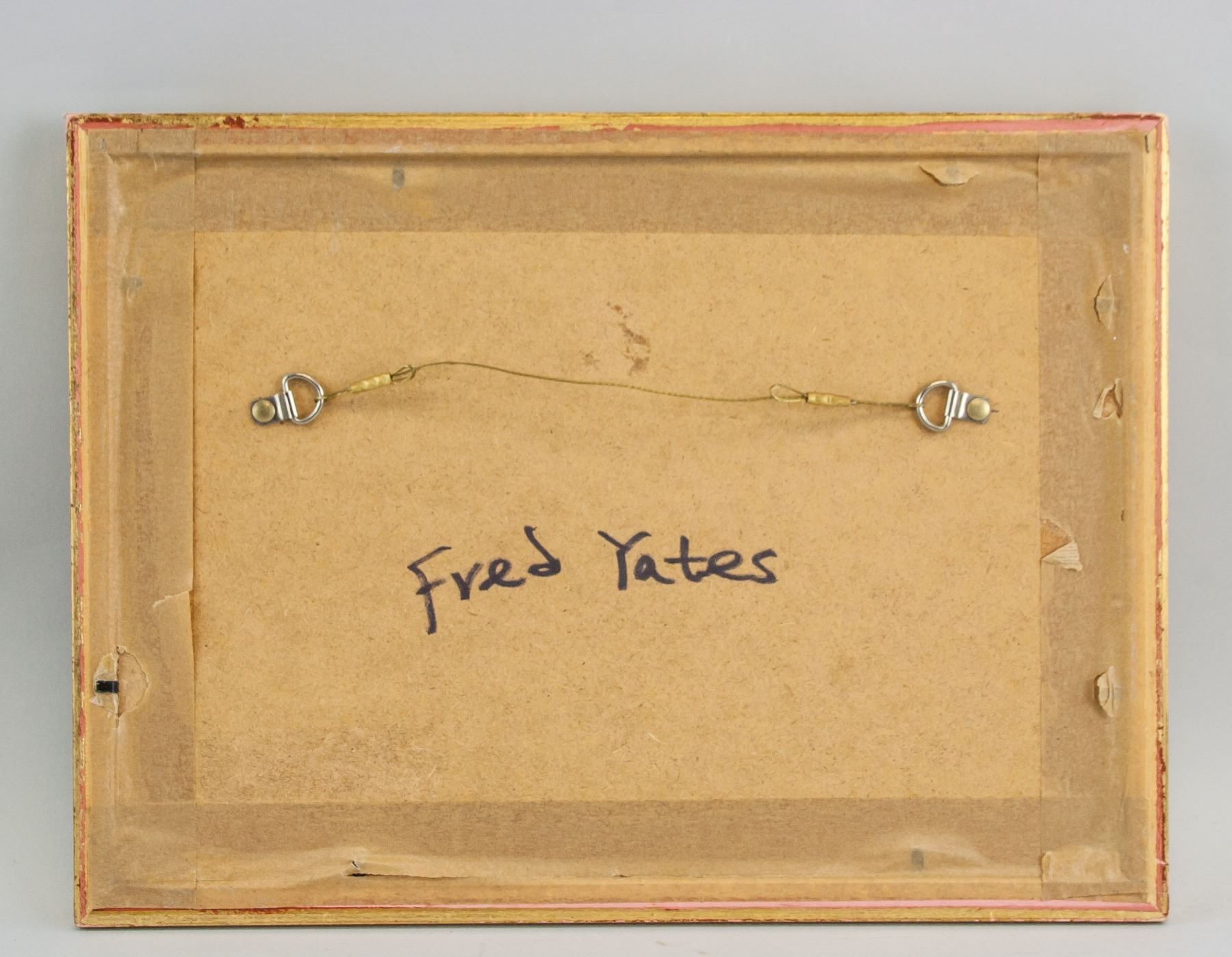 Oil on board, village scene, framed. Signed and attr. Fred Yates (British, 1922-2008) on lower right corner. 9.6 x 13.6 inch (24.5 x 34.5 cm). Fred Yates was a self-taught British artist, known for his plein-air paintings of the English landscape. Influenced by so-called naïve art, Yate’s work incorporated bold colors, loose brushwork, and child-like abstractions. His paintings are included in many private and public collections including Brighton and Hove Art Gallery, Liverpool University, the University of Warwick, Torquay Art Gallery and Russell Coates Gallery Bournemouth. PROVENANCE: Private collection (London, United Kingdom)