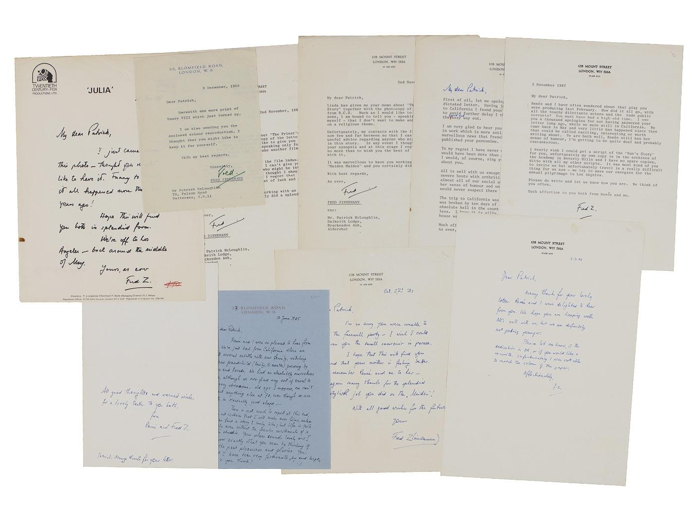 Academy Award—winning director of High Noon, From Here to Eternity, A Man For All Seasons, etc. Collection of nine letters, consisting of four ALSs and five TLSs, all signed “Fred,” “Fred Z.,” “F. Z.,” and one signed in full. All are written to Patrick McLoughlin in the 1980s and 1990s. Also included are seven letters signed by his wife Renee. In fine overall condition.
