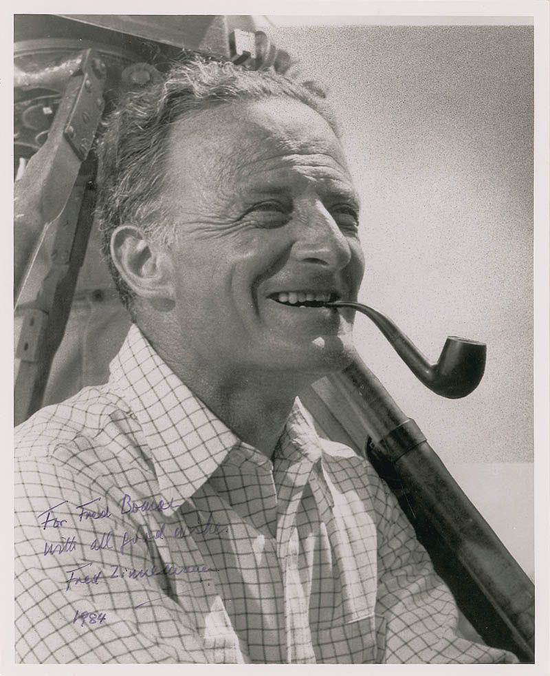 Glossy 8 x 10 photo of the director smoking a pipe, signed and inscribed in black felt tip “For Fred Bomar, With all good wishes, Fred Zinnemann.” In fine condition, with light scattered surface creases and impressions, mild rippling to the top edge, and the inscription and signature a shade light.