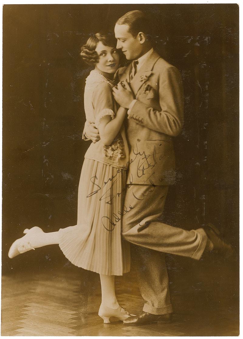 Vintage glossy 5 x 7 photo of the performing siblings, signed in fountain pen “Sincerely, Fred Astaire” and “Adele Astaire.” In very good condition, with some creasing, an irregular block of scuffing over the image area, some light signature contrast, and mild to moderate silvering to the darker portions.