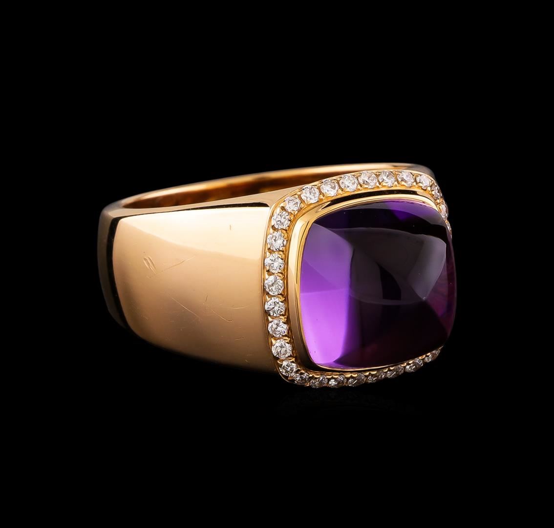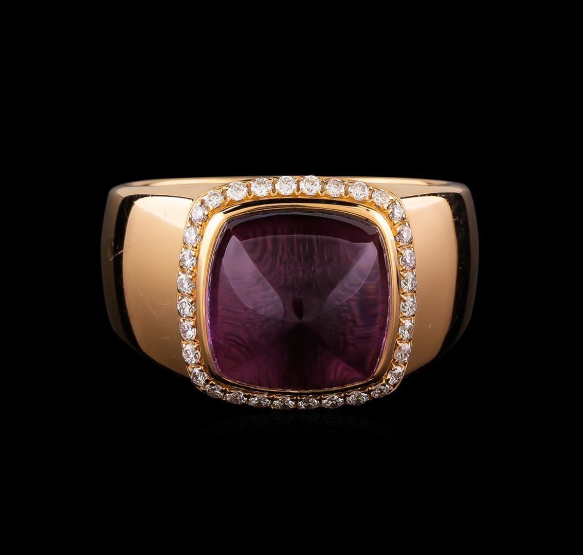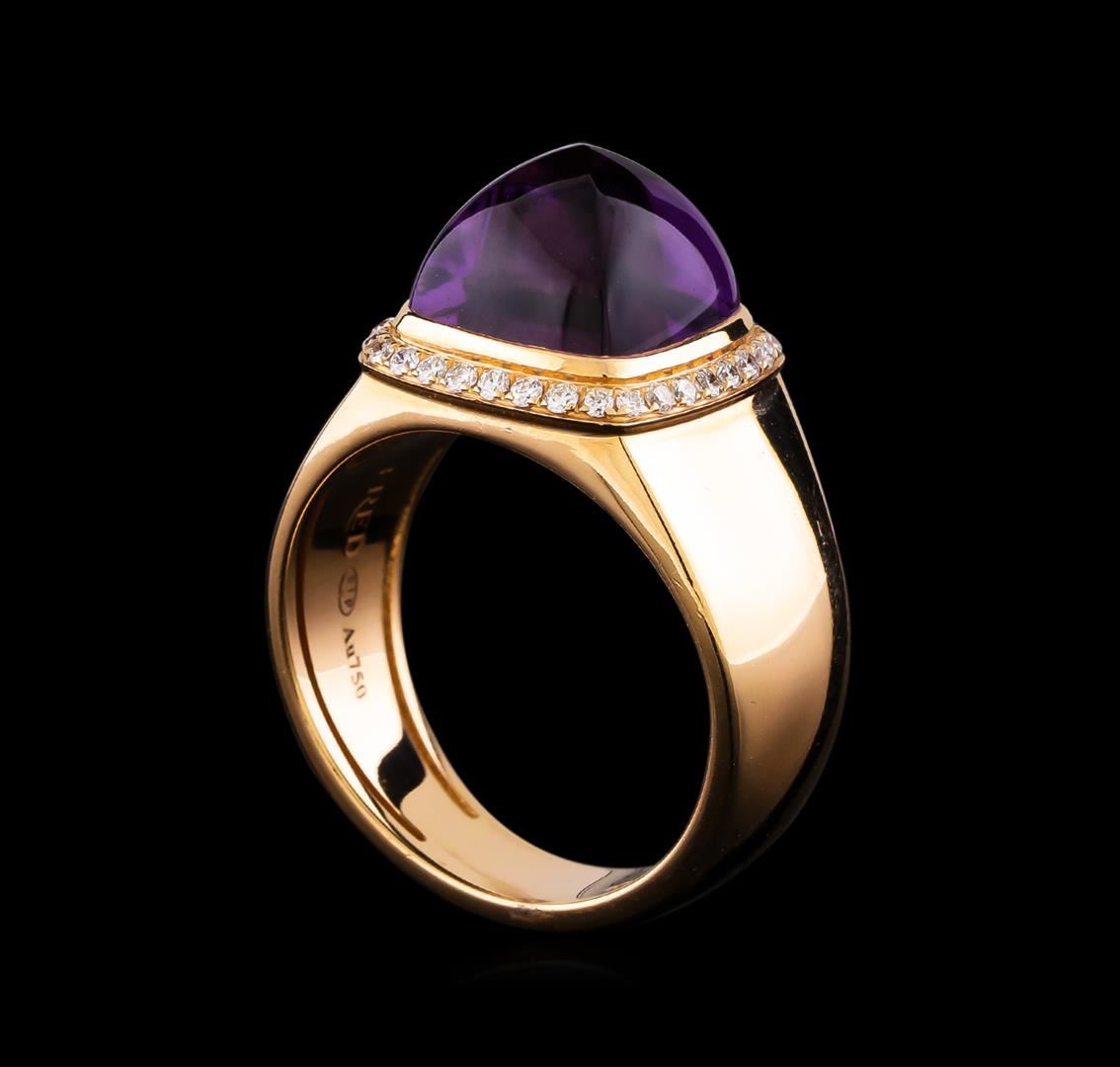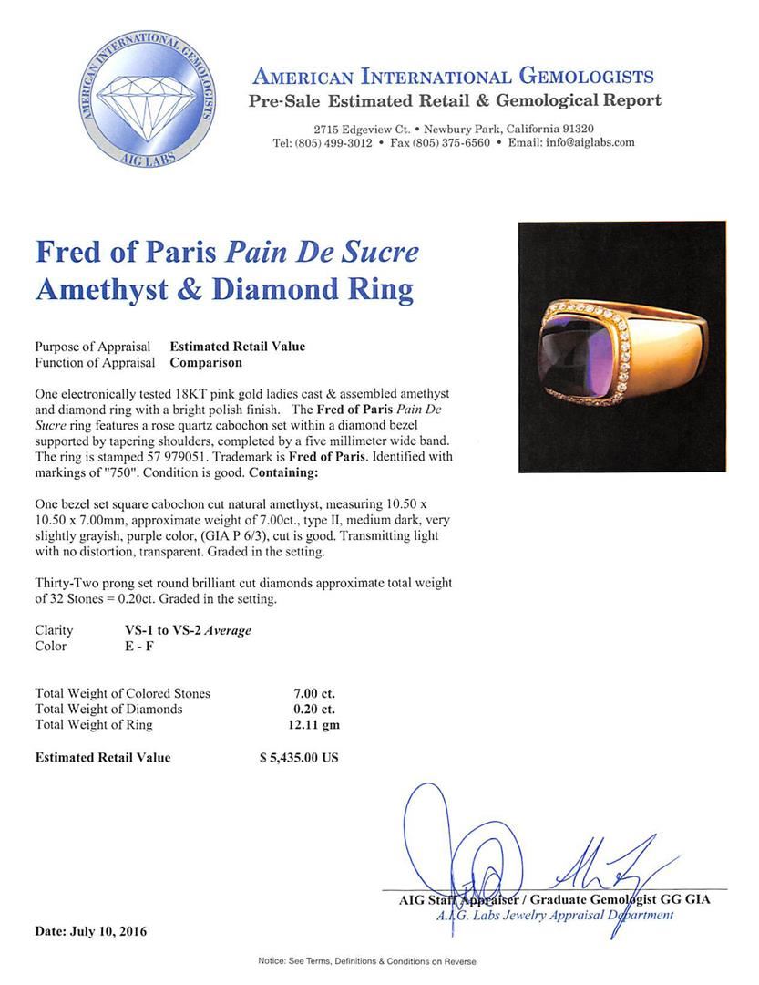 One electronically tested 18KT pink gold ladies cast & assembled amethyst and diamond ring with a bright polish finish. The Fred of Paris "Pain De Sucre" ring features a rose quartz cabochon set within a diamond bezel supported by tapering shoulders, completed by a five millimeter wide band. The ring is stamped 57 979051. Trademark is Fred of Paris. Identified with markings of "750". Condition is good. Containing: One bezel set square cabochon cut natural amethyst, measuring 10.50 x 10.50 x 7.00mm, approximate weight of 7.00ct., type II, medium dark, very slightly grayish, purple color, (GIA P 6/3), cut is good. Transmitting light with no distortion, transparent. Graded in the setting. Thirty-Two prong set round brilliant cut diamonds approximate total weight of 32 Stones = 0.20ct. Graded in the setting. Clarity VS-1 to VS-2. Color: E - F. Total Weight of Colored Stones 7.00ct.. Total Weight of Diamonds 0.20ct.. Total Weight of Ring 12.11gm. AIG Appraised at $5,435.00.