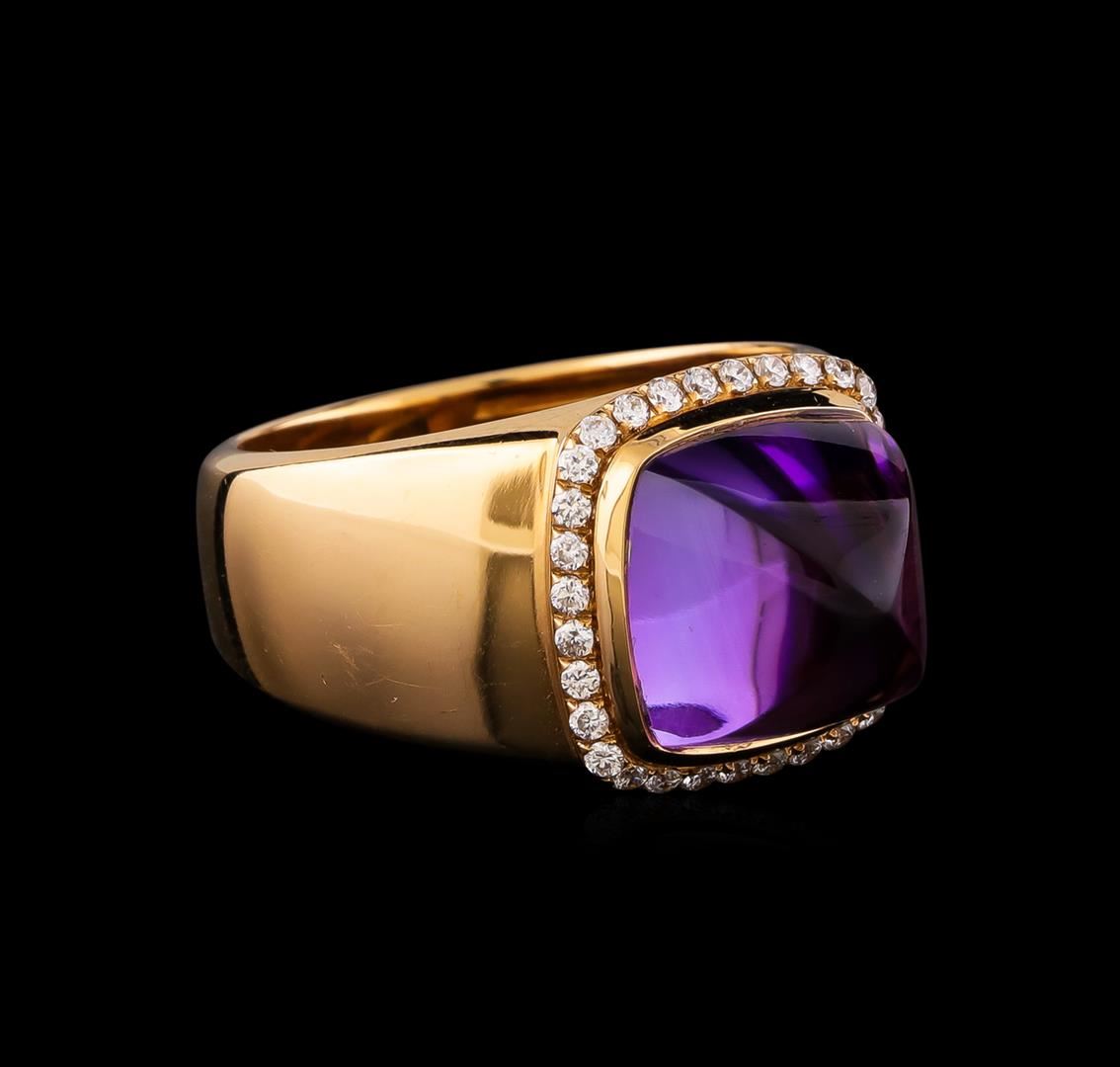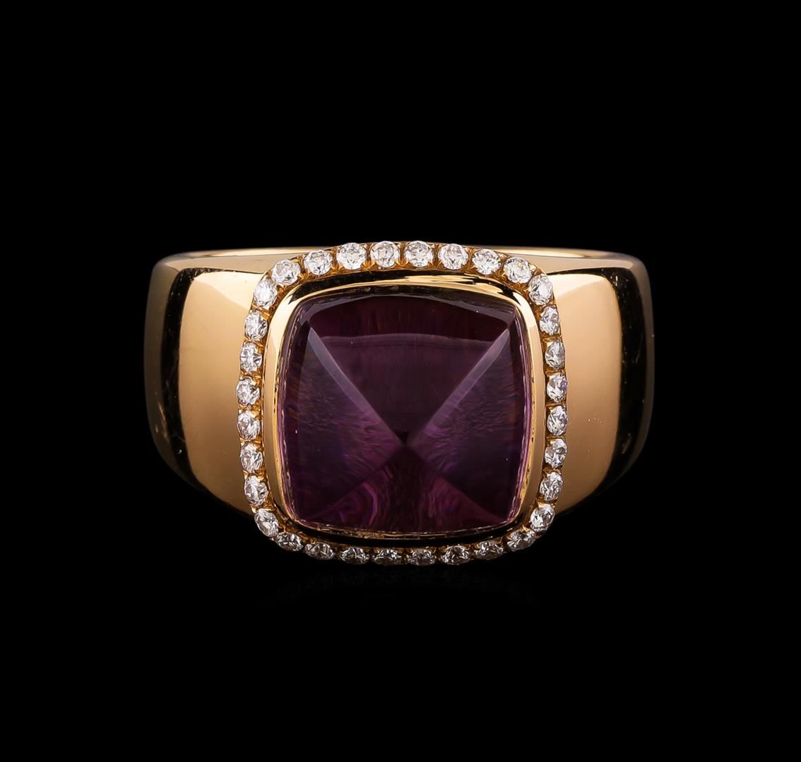 One electronically tested 18KT pink gold ladies cast & assembled amethyst and diamond ring with a bright polish finish. The Fred of Paris "Pain De Sucre" ring features a rose quartz cabochon set within a diamond bezel supported by tapering shoulders, completed by a five millimeter wide band. The ring is stamped 56 950721. Trademark is Fred of Paris. Identified with markings of "750". Condition is good. Containing: One bezel set square cabochon cut natural amethyst, measuring 10.20 x 10.20 x 8.00mm, approximate weight of 7.00ct., type II, medium dark, very slightly grayish, purple color, (GIA P 6/3), cut is good. Transmitting light with no distortion, transparent. Graded in the setting. Thirty-Two prong set round brilliant cut diamonds approximate total weight of 32 Stones = 0.20ct. Graded in the setting. Clarity VS-1 to VS-2. Color: E - F. Total Weight of Colored Stones 7.00ct.. Total Weight of Diamonds 0.20ct.. Total Weight of Ring 11.88gm. AIG Appraised at $5,435.00.