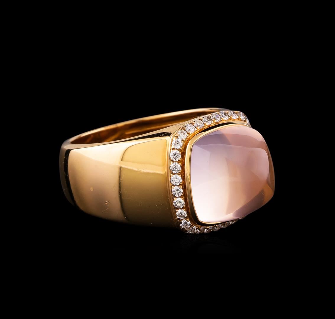 One electronically tested 18KT pink gold ladies cast & assembled rose quartz and diamond ring with a bright polish finish. The Fred of Paris "Pain De Sucre" ring features a rose quartz cabochon set within a diamond bezel supported by tapering shoulders, completed by a five millimeter wide band. The ring is stamped 54 950659. Trademark is Fred of Paris. Identified with markings of "750". Condition is good. Containing: One bezel set square cabochon cut natural rose quartz, measuring 10.50 x 10.50 x 7.00mm, approximate weight of 7.00ct., very light, very slightly grayish, pink color, (GIA Pk 2/3), cut is good. Transmitting light somewhat diffusely, transparent to translucent. Naturally occurring internal & external characteristics are present. Graded in the setting. Thirty-Two prong set round brilliant cut diamonds approximate total weight of 32 Stones = 0.20ct. Graded in the setting. Clarity VS-1 to VS-2. Color: E - F. Total Weight of Colored Stones 7.00ct.. Total Weight of Diamonds 0.20ct.. Total Weight of Ring 11.44gm. AIG Appraised at $4,880.00.
