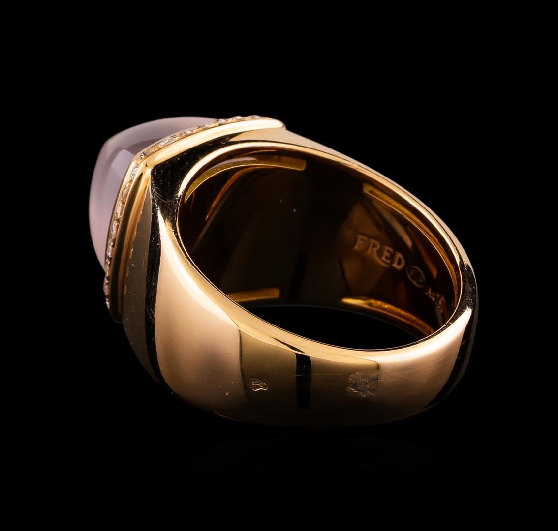 One electronically tested 18KT pink gold ladies cast & assembled rose quartz and diamond ring with a bright polish finish. The Fred of Paris "Pain De Sucre" ring features a rose quartz cabochon set within a diamond bezel supported by tapering shoulders, completed by a five millimeter wide band. The ring is stamped 531017090. Trademark is Fred of Paris. Identified with markings of "750". Condition is good. Containing: One bezel set square cabochon cut natural rose quartz, measuring 10.30 x 10.30 x 7.00mm, approximate weight of 7.00ct., very light, very slightly grayish, pink color, (GIA Pk 2/3), cut is good. Transmitting light somewhat diffusely, translucent. Naturally occurring internal & external characteristics are present. Graded in the setting. Thirty-Two prong set round brilliant cut diamonds approximate total weight of 32 Stones = 0.20ct. Graded in the setting. Clarity VS-1 to VS-2. Color: E - F. Total Weight of Colored Stones 7.00ct.. Total Weight of Diamonds 0.20ct.. Total Weight of Ring 10.84gm. AIG Appraised at $4,880.00.
