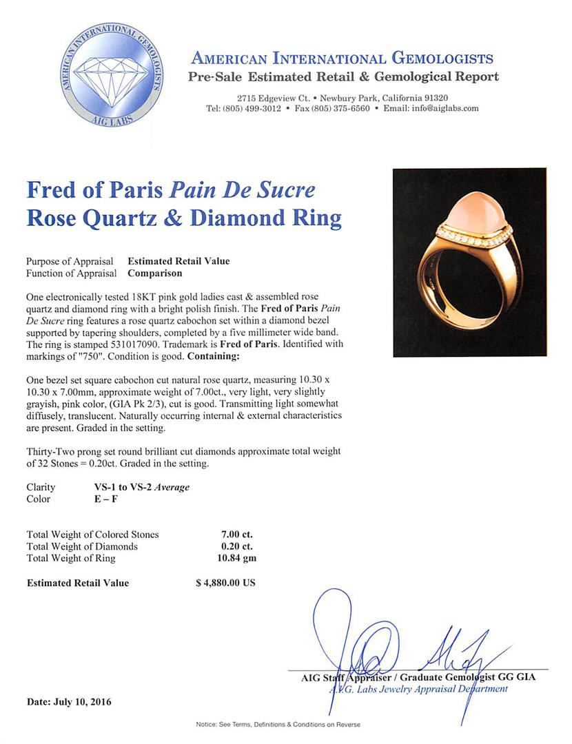 One electronically tested 18KT pink gold ladies cast & assembled rose quartz and diamond ring with a bright polish finish. The Fred of Paris "Pain De Sucre" ring features a rose quartz cabochon set within a diamond bezel supported by tapering shoulders, completed by a five millimeter wide band. The ring is stamped 531017090. Trademark is Fred of Paris. Identified with markings of "750". Condition is good. Containing: One bezel set square cabochon cut natural rose quartz, measuring 10.30 x 10.30 x 7.00mm, approximate weight of 7.00ct., very light, very slightly grayish, pink color, (GIA Pk 2/3), cut is good. Transmitting light somewhat diffusely, translucent. Naturally occurring internal & external characteristics are present. Graded in the setting. Thirty-Two prong set round brilliant cut diamonds approximate total weight of 32 Stones = 0.20ct. Graded in the setting. Clarity VS-1 to VS-2. Color: E - F. Total Weight of Colored Stones 7.00ct.. Total Weight of Diamonds 0.20ct.. Total Weight of Ring 10.84gm. AIG Appraised at $4,880.00.