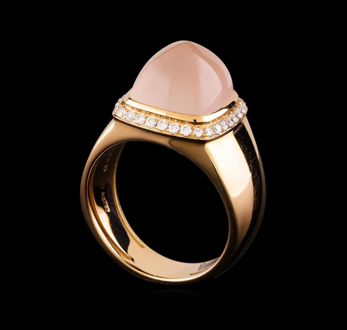 One electronically tested 18KT pink gold ladies cast & assembled rose quartz and diamond ring with a bright polish finish. The Fred of Paris "Pain De Sucre" ring features a rose quartz cabochon set within a diamond bezel supported by tapering shoulders, completed by a five millimeter wide band. The ring is stamped 531017090. Trademark is Fred of Paris. Identified with markings of "750". Condition is good. Containing: One bezel set square cabochon cut natural rose quartz, measuring 10.30 x 10.30 x 7.00mm, approximate weight of 7.00ct., very light, very slightly grayish, pink color, (GIA Pk 2/3), cut is good. Transmitting light somewhat diffusely, translucent. Naturally occurring internal & external characteristics are present. Graded in the setting. Thirty-Two prong set round brilliant cut diamonds approximate total weight of 32 Stones = 0.20ct. Graded in the setting. Clarity VS-1 to VS-2. Color: E - F. Total Weight of Colored Stones 7.00ct.. Total Weight of Diamonds 0.20ct.. Total Weight of Ring 10.84gm. AIG Appraised at $4,880.00.