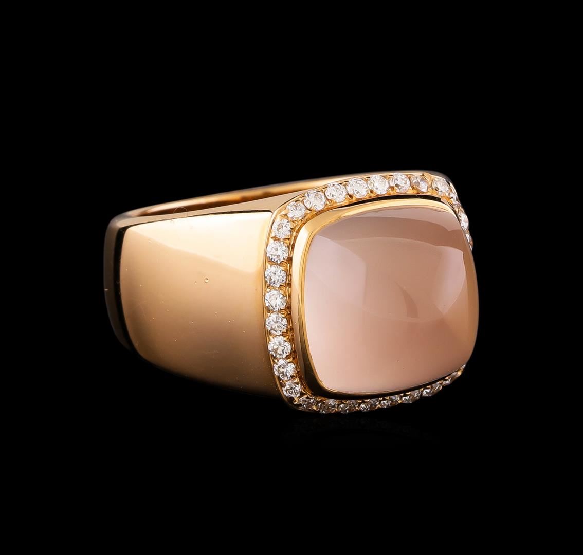One electronically tested 18KT pink gold ladies cast & assembled rose quartz and diamond ring with a bright polish finish. The Fred of Paris "Pain De Sucre" ring features a rose quartz cabochon set within a diamond bezel supported by tapering shoulders, completed by a five millimeter wide band. The ring is stamped 531017090. Trademark is Fred of Paris. Identified with markings of "750". Condition is good. Containing: One bezel set square cabochon cut natural rose quartz, measuring 10.30 x 10.30 x 7.00mm, approximate weight of 7.00ct., very light, very slightly grayish, pink color, (GIA Pk 2/3), cut is good. Transmitting light somewhat diffusely, translucent. Naturally occurring internal & external characteristics are present. Graded in the setting. Thirty-Two prong set round brilliant cut diamonds approximate total weight of 32 Stones = 0.20ct. Graded in the setting. Clarity VS-1 to VS-2. Color: E - F. Total Weight of Colored Stones 7.00ct.. Total Weight of Diamonds 0.20ct.. Total Weight of Ring 10.84gm. AIG Appraised.
