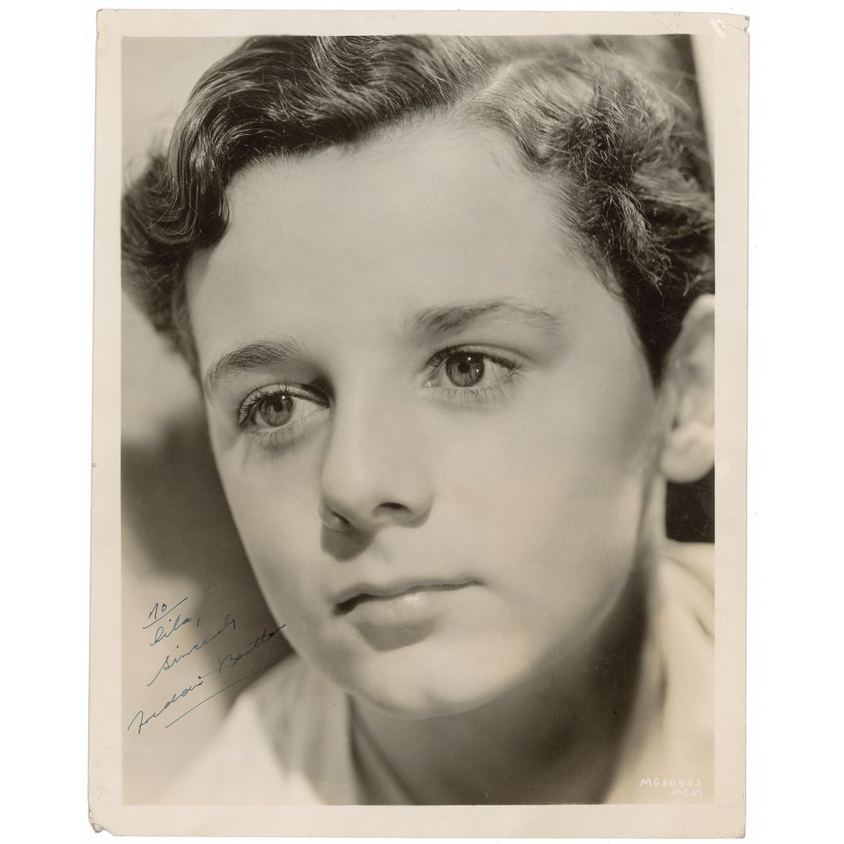 Adorable vintage glossy 8 x 10 close-up photo of a young Bartholomew, signed and inscribed in fountain pen, “To Lila, Sincerely, Freddie Bartholomew.” In very good condition, with some light creasing, a surface mark lightly affecting the facial area, wrinkling to the bottom left and top right corners, some trivial silvering, and light contrast to the signature against the darker background.
