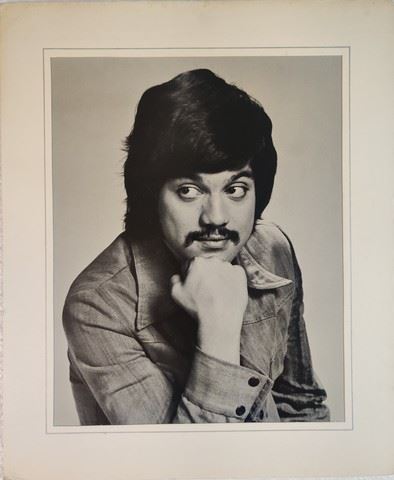 Freddie Prinze publicity photo as he hosted The Tonight Show in 1975. Very light edge wear in frame. Excellent. Photo measuring 7.75"x9.75", frame measuring 10"x12".