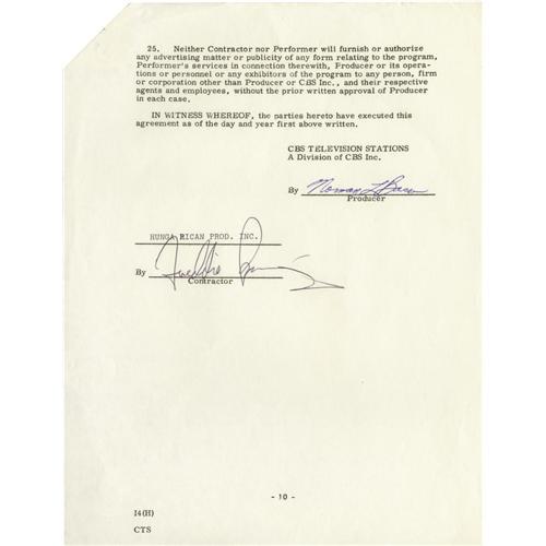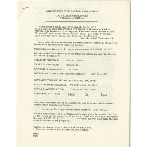 <B>Freddie Prinze Signed Television Contract.</B></I> Ten-page independent contractor's agreement between CBS and Prinze's production company, dated July 16, 1975, regarding his appearance on <I>Dinah!.</B></I> Prinze's meteoric rise to fame as a stand-up comic and star of the TV show <I>Chico and the Man</B></I> was cut short in 1977 by his death from a self-inflicted gunshot wound. The contract is signed by Prinze in in black ink on the last page, and is in Excellent condition with minimal wear. <I>Accompanied by a certificate of authenticity.</B></I><I>Accompanied by LOA from PSA/DNA.</B></I><BR><BR><b>Shipping:</b> Small Flat (<a target="_blank" href="http://www.heritageauctions.com/common/shipping.php">view shipping information</a>)