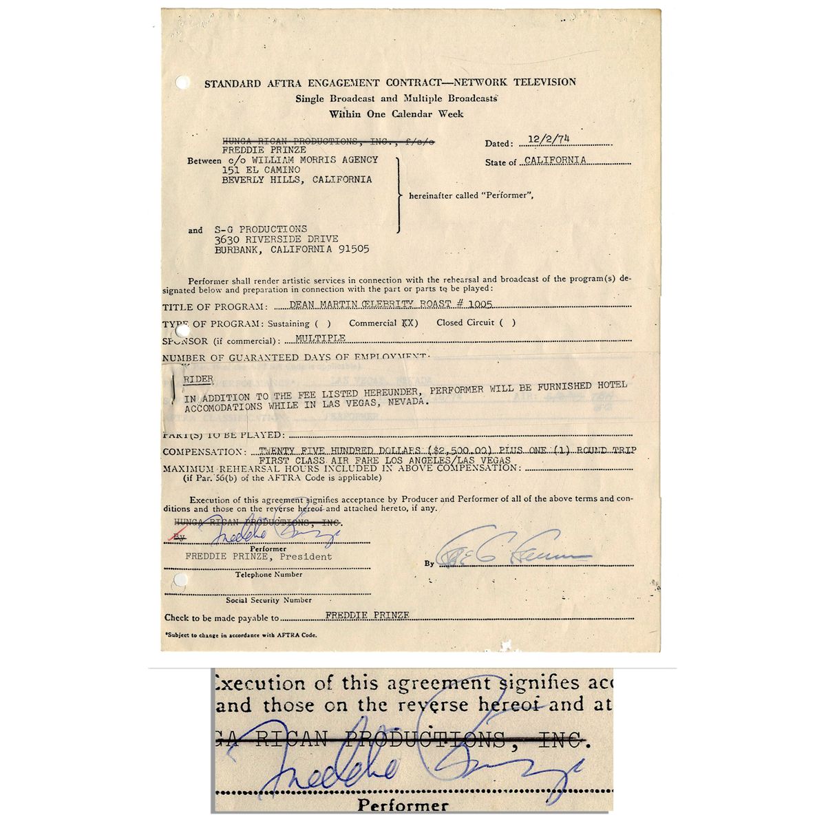 Document signed by Freddie Prinze Sr. contracting him to appear on the Dean Martin Celebrity Roast. Compensation included $2,500, a round trip ticket from Los Angeles to Las Vegas and hotel accommodations while in Nevada. Datelined California, 2 December 1974, signature in blue ink is very clear. Measures 8.5'' x 11''. Staple holes along top margin and very minute creasing. Near fine condition.