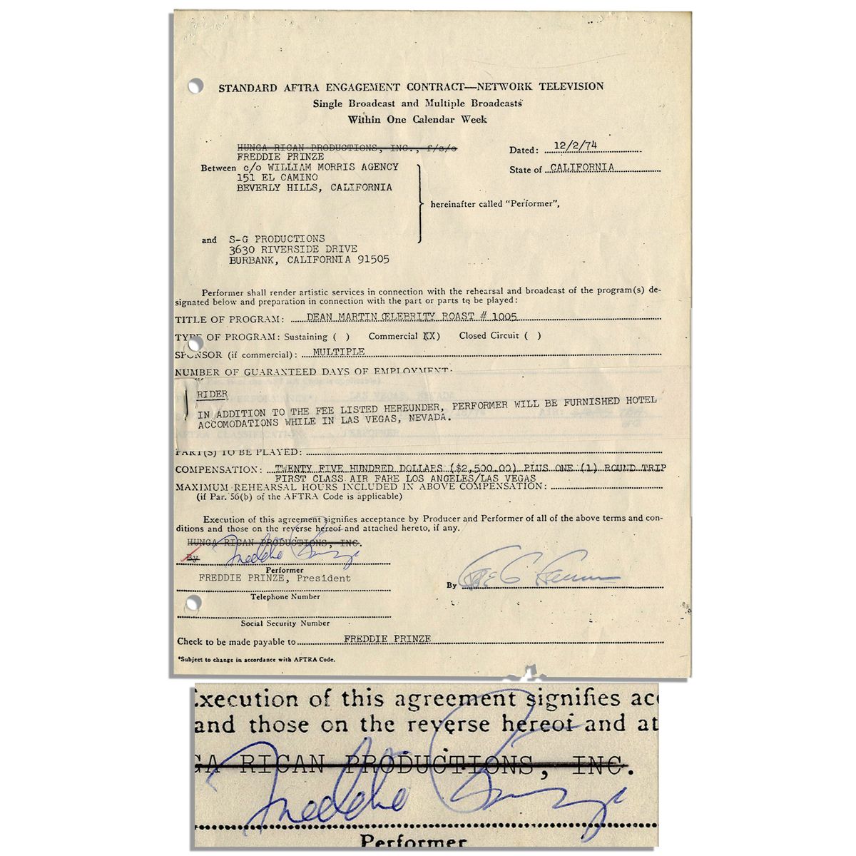 Document signed by Freddie Prinze Sr. contracting him to appear on the Dean Martin Celebrity Roast. Compensation included $2,500, a round trip ticket from Los Angeles to Las Vegas and hotel accommodations while in Nevada. Datelined California, 2 December 1974, signature in blue ink is very clear. Measures 8.5'' x 11''. Staple holes along top margin and very minute creasing. Near fine condition.