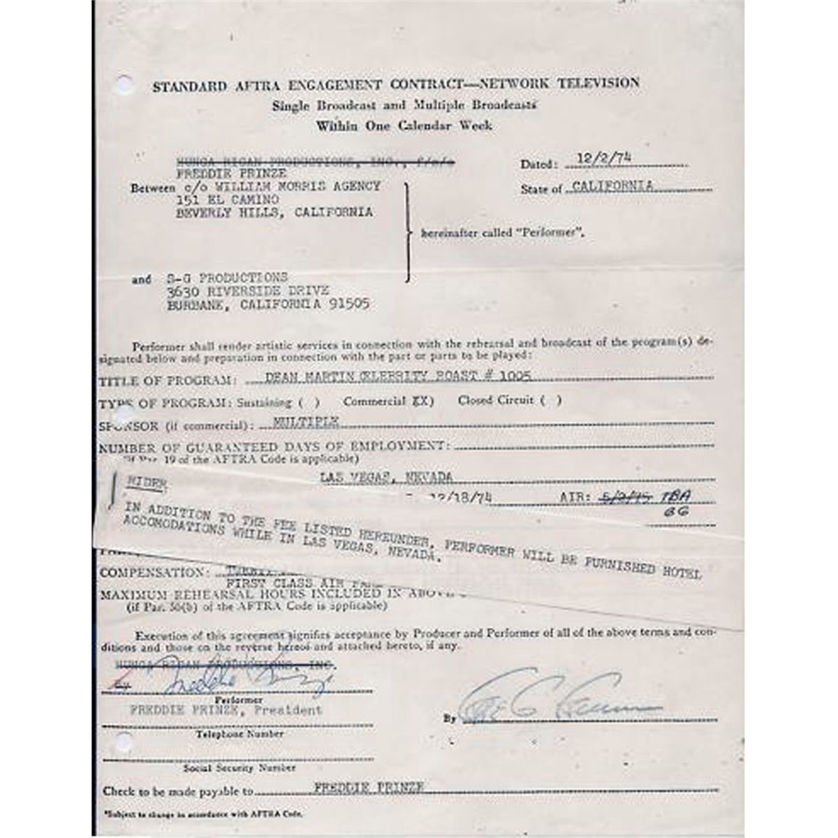 Document signed by Freddie Prinze Sr. contracting him to appear on the Dean Martin Celebrity Roast. Compensation included $2,500, a round trip ticket from Los Angeles to Las Vegas and hotel accommodations while in Nevada. Datelined California, 2 December 1974, signature in blue ink is very clear. Measures 8.5'' x 11''. Staple holes along top margin and very minute creasing. Near fine condition.
