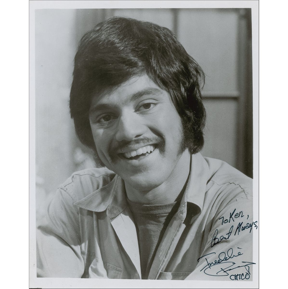 Popular ‘Hungarican’ stand-up comedian and actor (1954–1977), best known for his starring role in the sitcom Chico and the Man, who committed suicide by gunshot at the age of 22. Vintage glossy 8 x 10 photo, signed and inscribed in black felt tip “To Ken, Best always, Freddie Prinze, Chico.” In fine condition, with a couple scattered light surface marks, and Prinze writing over an unsuccessful first attempt of the inscription.