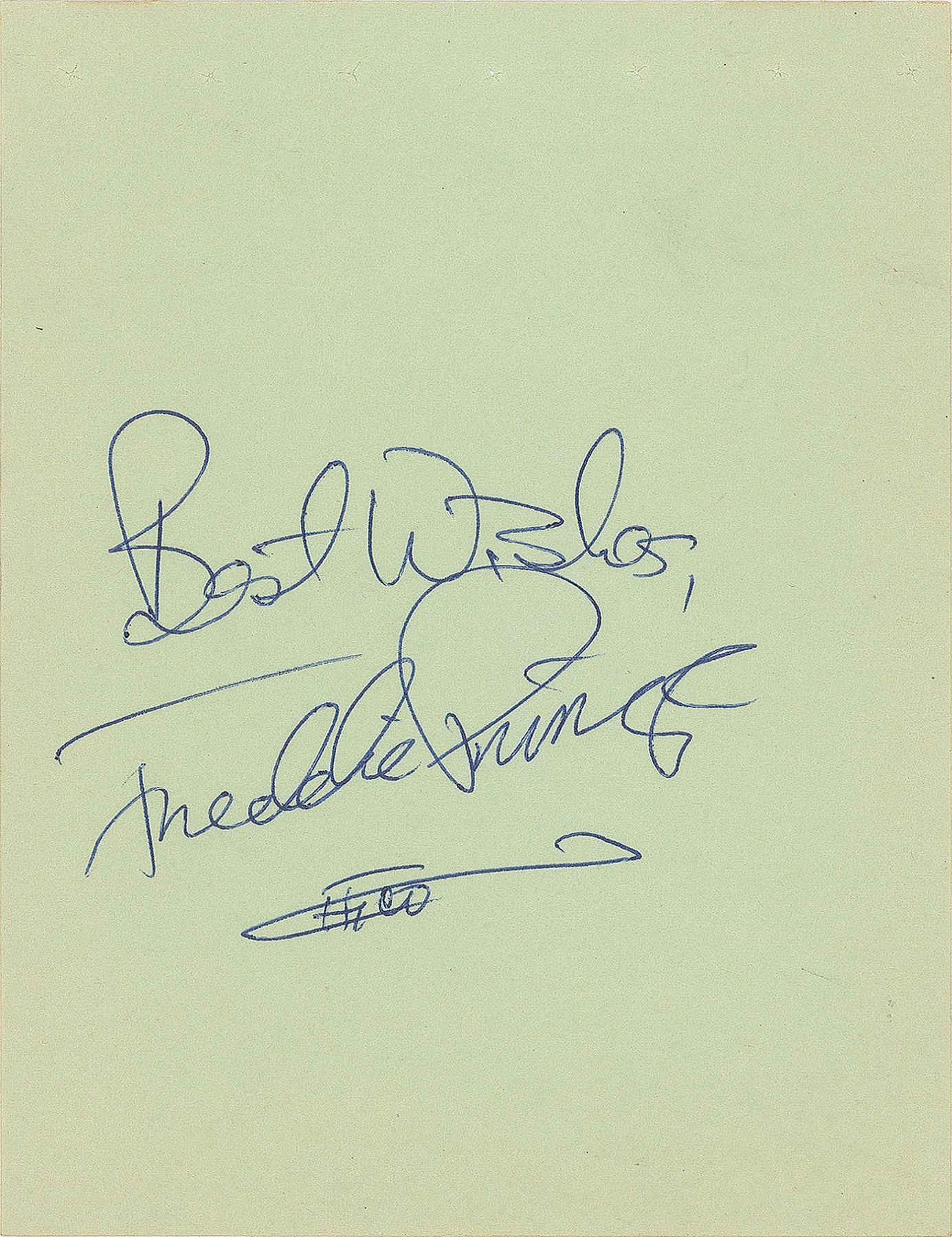 Vintage ballpoint signature, "Best Wishes, Freddie Prinze, Chico,” on a light green 4.5 x 5.75 album page. In fine condition. From the Harvey and Rhoda Kuflik Collection.