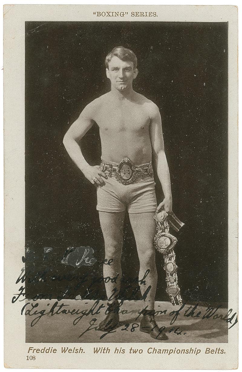 Lightweight boxing champion who held the World Lightweight Champion title 1914–1917. Vintage 3.5 x 5.5 postcard photo, signed and inscribed “To B. U. Pierce, With every good wish from Freddie Welsh (Lightweight Champion of the World). July 28, 1914.” In very good condition, with corner bends and creasing, a few scratches, emulsion crazing and chipping affecting a few letters of his name, staining and chipping to the inscription, and surface postal impressions.
