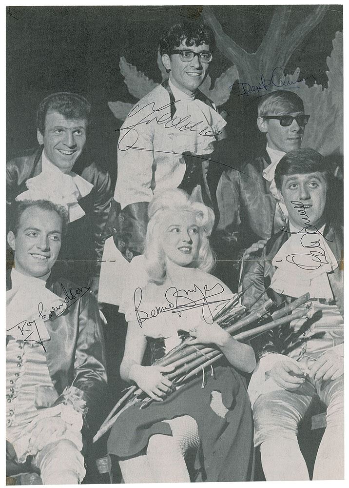 Vintage semi-glossy glossy 9.5 x 13.5 magazine photo of Freddie and the Dreamers dressed in period costume, signed in black ballpoint by founding members Freddie Garrity, Derek Quinn, Peter Birrell, Bernie Dwyer, and Roy Crewdson. In very good to fine condition, with trimmed edges, creasing, and a central horizontal fold.
