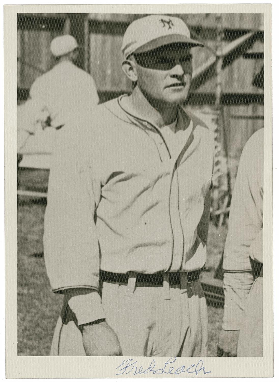 Major League outfielder (1897-1981) who played for the New York Giants, Boston Braves, and Philadelphia Phillies. Vintage matte-finish 5 x 7 photo of Leach in his New York Giants uniform, signed in the lower border in blue ballpoint. In fine condition, with some mild rippling along top edge.