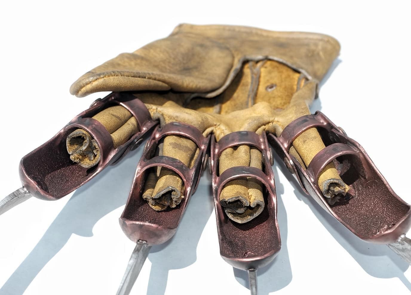 This is a all Kydex stunt version of the Freddy glove. The Kydex version of the glove was assembled from original production pieces post production. Aside from the 4 Kydex claws, purchased from materials post-production, the Kydex finger joints and back plate were cut and ready for assembly during the time of production. A master claw was made during production to pattern them all.