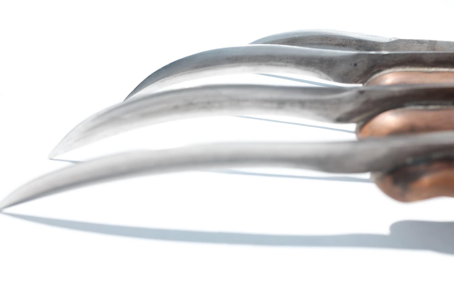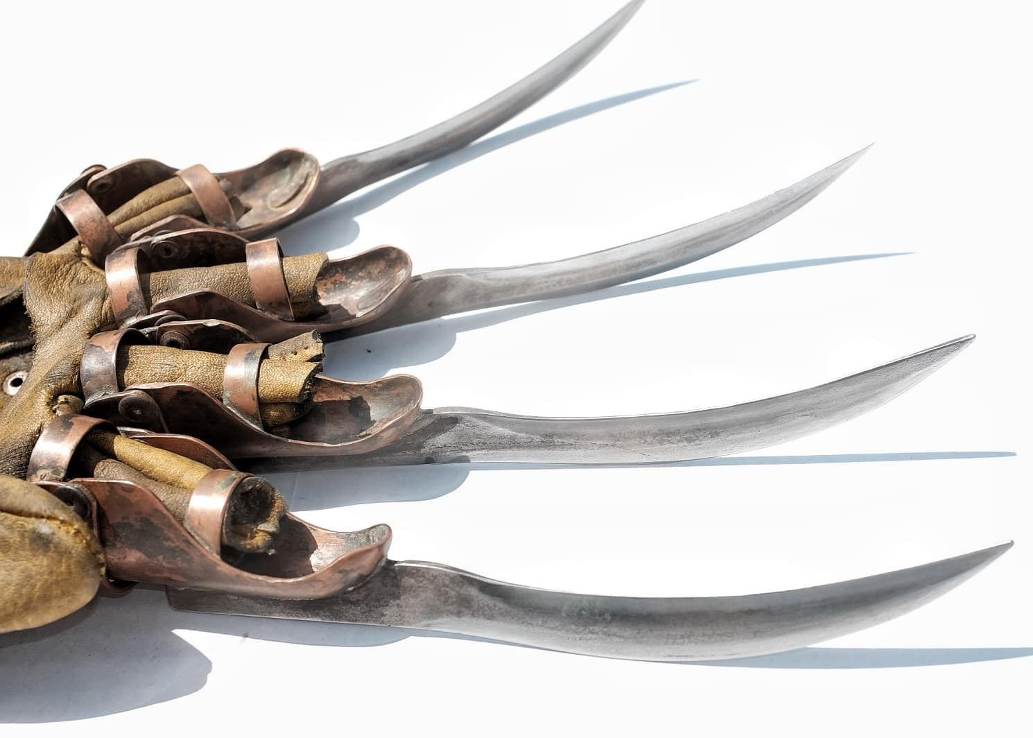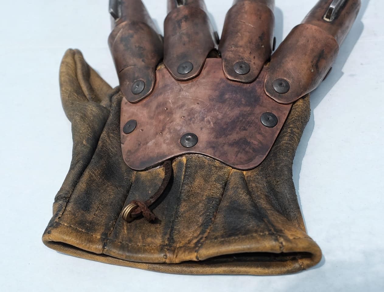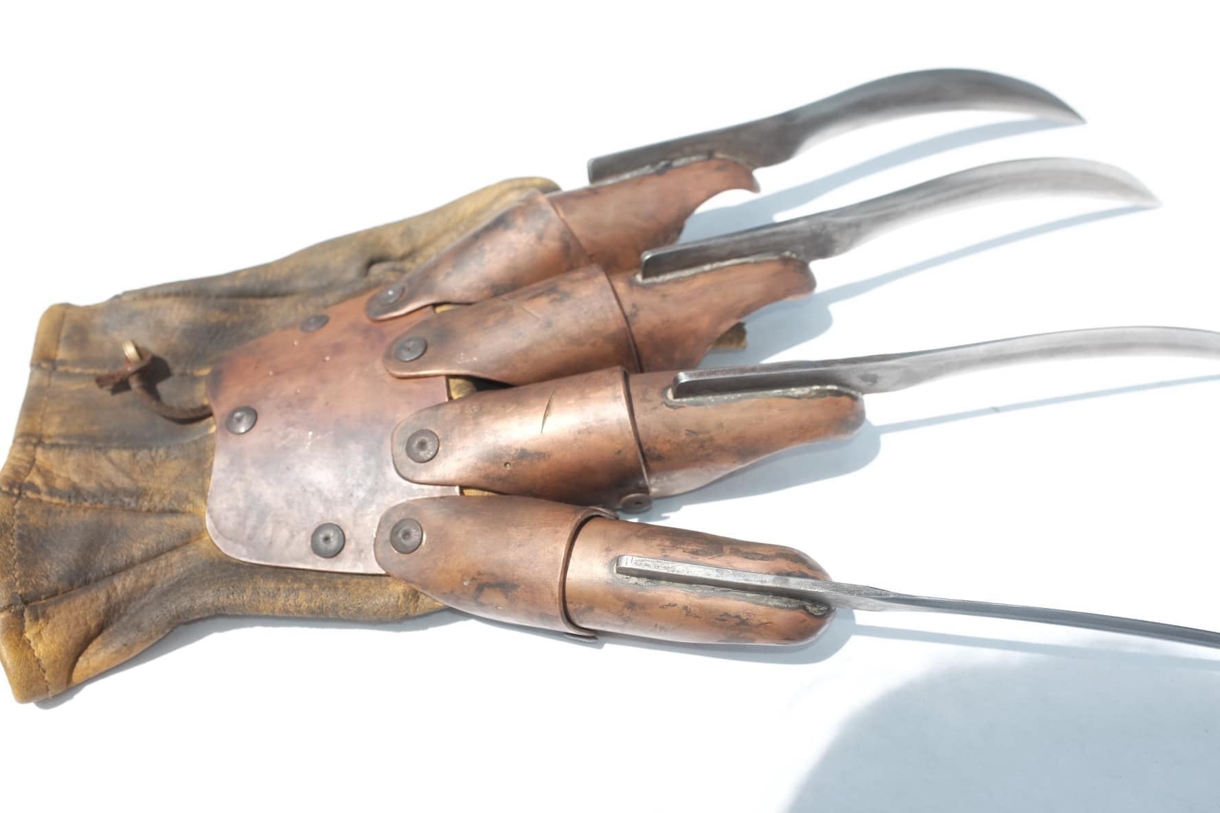 This is a hero close up Freddy glove, steel clawed version of the glove assembled from original production pieces post production. 4 claws were cut from aluminum stock left over from production using a master claw that was made to pattern all of them, then finished and ready for welding to the copper finger pieces. The gloves were specially ordered for the production from the manufacturer without their embossed stamped name on the leather in Vancouver Canada where it was shot.