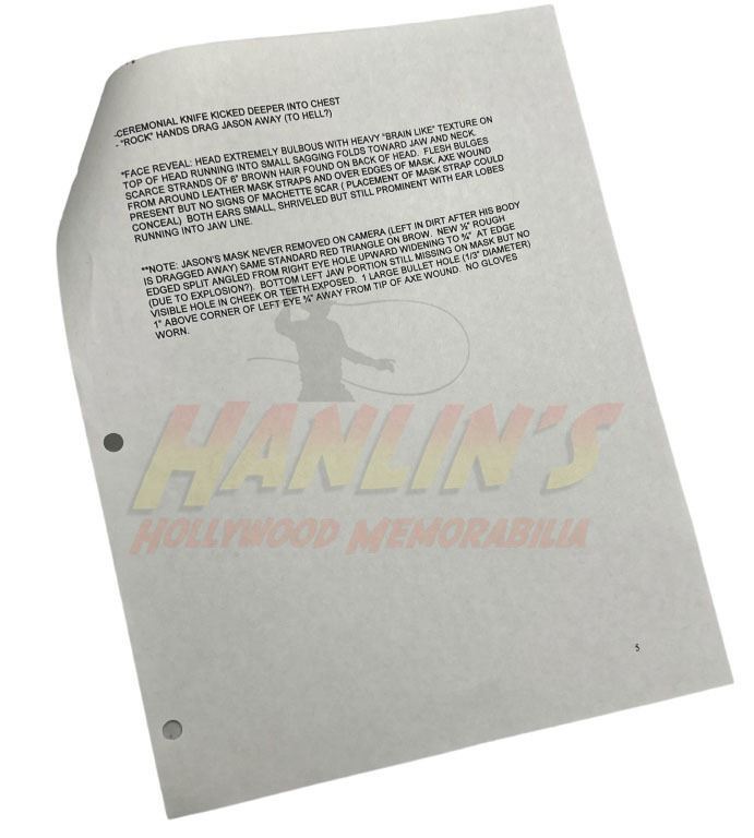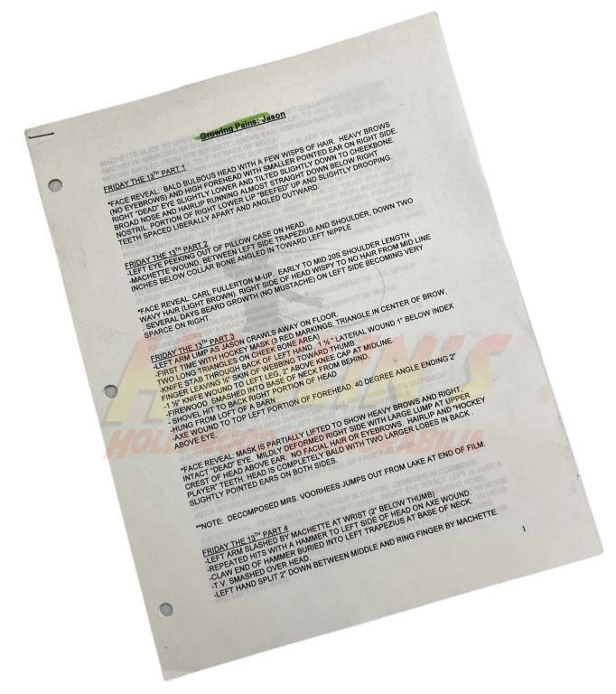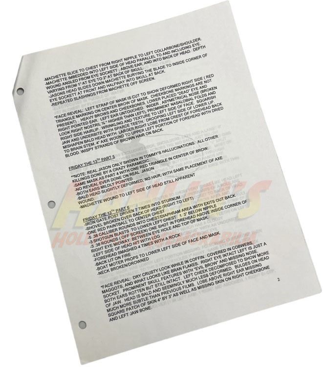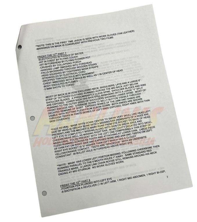 Original set of 3 sheets with a synopses of all of Jason's wounds and damage he takes, used by Bill Terezakis to help design the mask and look for Jason in the production of the Ronny Yu directed slasher film 'Freddy vs. Jason' (2003), the crossover between the Nightmare on Elm Street and Friday the 13th series.