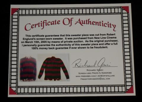 Freddy vs. Jason - An original piece of Robert Englund's screen worn sweater as Freddy Krueger on a displayable sheet autographed by Mr. Englund. Also includes a certificate and insignia on back of photo. 8.5" x 11"