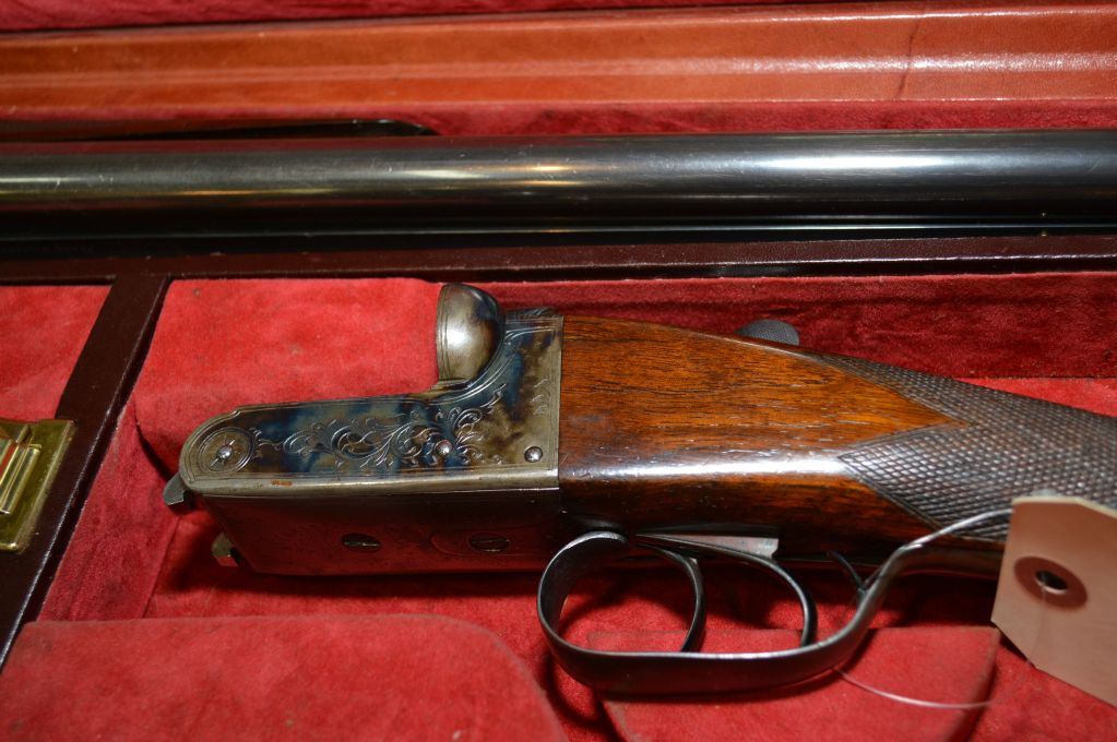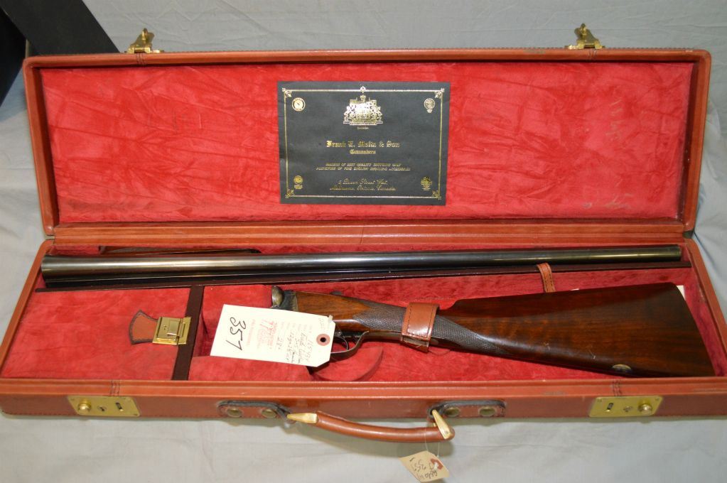 Frede Williams Gun Makers Ltd Birmingham, England Model Side By Side Hammerless .12 Ga 2 1/2" Nitro Proofed Side By SIde Shotgun w/ 28" blued finish barrels Marked Cedar Springs Game Farm Chatsworth, Ontario, engraved case colored receiver, trigger guard, etc., straight checkered English style stock w/ checkered butt, inlay w/ initials in a Frank E Mallin & Son Gun Maker's , Melbourne Ont Canada fitted luggage style case ] Ser # 165434