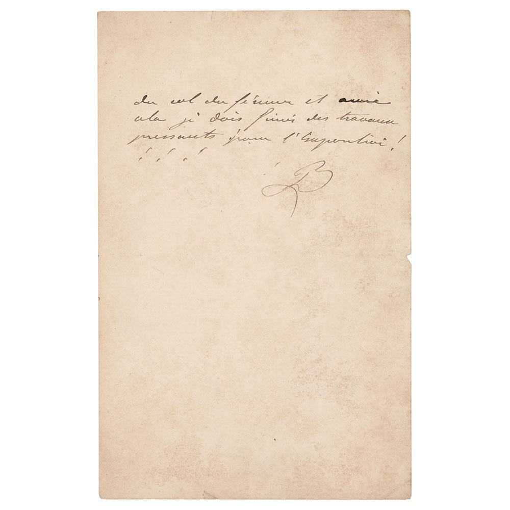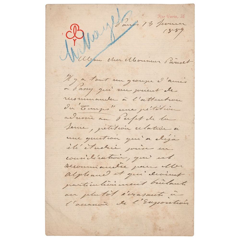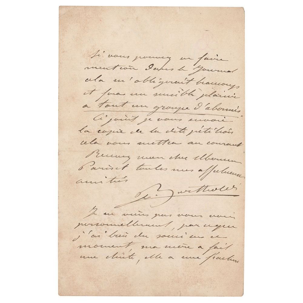 ALS in French, signed “Bartholdi,†three pages on two adjoining sheets, 5.25 x 8.25, personal letterhead, February 13, 1889. Untranslated handwritten letter by Bartholdi, with a handwritten postscript signed with his initial, "B." In very good to fine condition, with light staining and soiling.