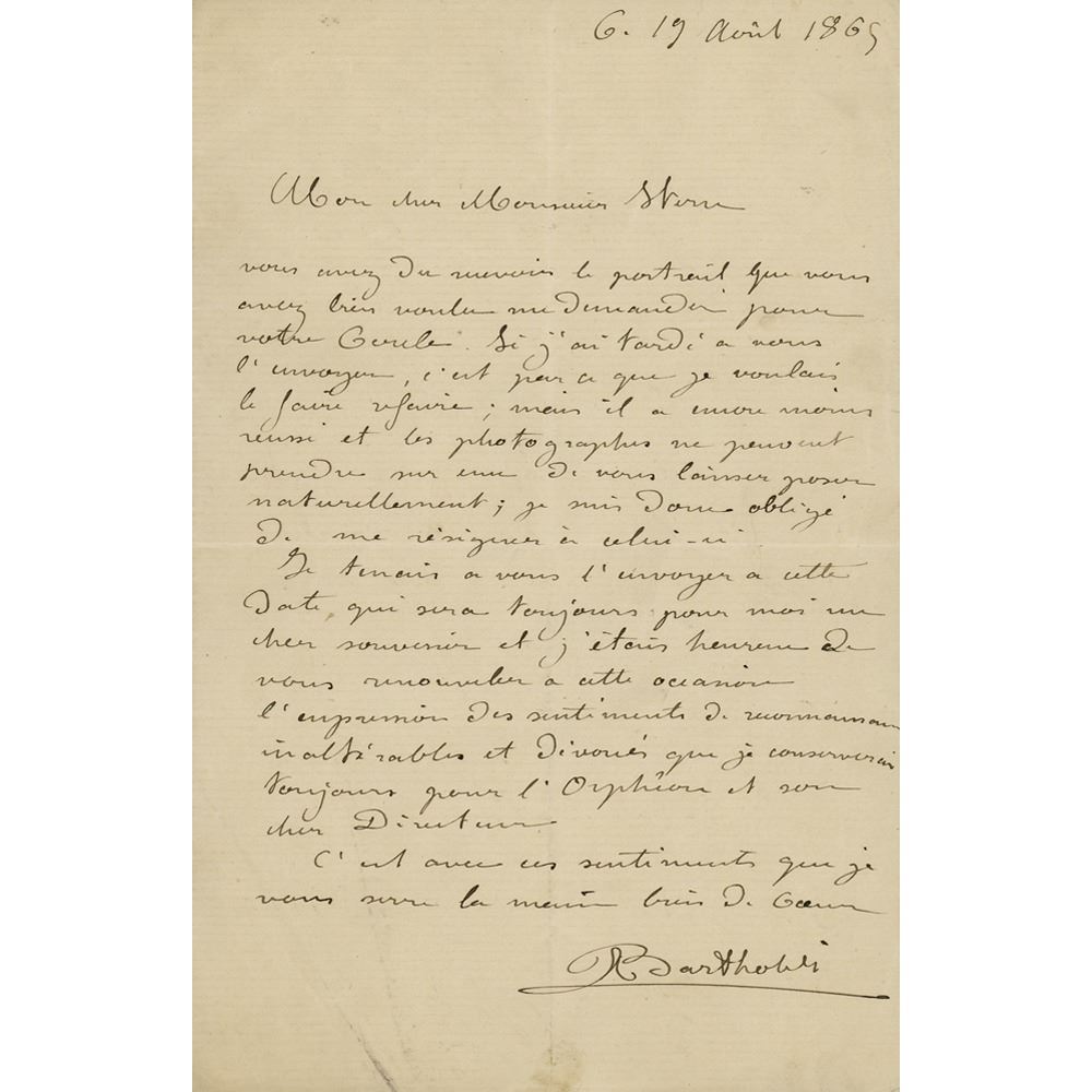 ALS in French, signed “Bartholdi,” one page, 5.25 x 8.25, April 19, 1865. Handwritten letter to Mr. Stern, in part (translated): "You must have received the portrait which you so kindly requested for your…If I delayed its shipment it's because I wanted to have it redone; but it came out even worse and the photographs cannot be taken without a natural pose so I'm forced to settle for this one. I wanted to send it to you on that date which will always be special to me and I was happy to have a chance to assure you of my inalterable and devoted gratitude which I will always feel towards the Orpheon and its dear director." In fine condition.
