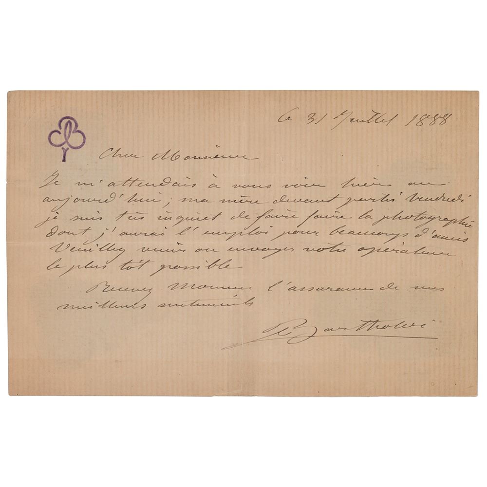 Eminent French sculptor (1834-1904) best known for designing the Statue of Liberty. ALS in French, signed “Bartholdi,” one page, 8.25 x 5.25, personal letterhead, July 31, 1888. Handwritten letter to a gentleman, in part (translated): "I am waiting to see you…today; my mother is leaving Friday. I'm very upset about asking you to do the photography I need…I use a great many…Please…send…as soon as possible." In very good to fine condition, with light show-through from some old tape and mounting remnants on the back.
