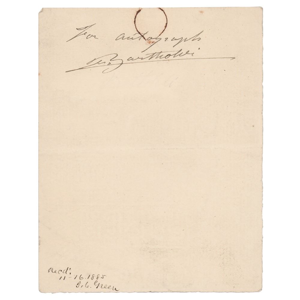 Eminent French sculptor (1834–1904) best known for designing the Statue of Liberty. Ink signature, "For autograph, Bartholdi,†on an off-white 3.5 x 4.5 slip. In fine condition, with a rusty paperclip impression to the top edge.