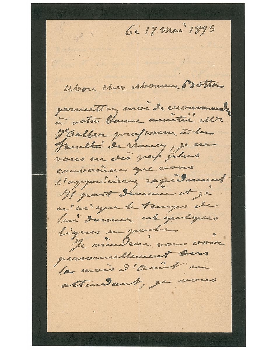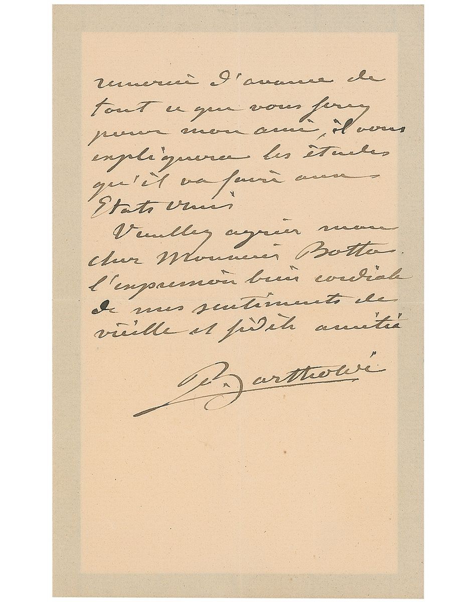 Eminent French sculptor (1834–1904) best known for designing the Statue of Liberty. Untranslated ALS in French, signed “Bartholdi,” two pages on two adjoining sheets, 4.25 x 7, black-bordered stationery, May 17, 1893. Untranslated letter to a gentleman. Central vertical and horizontal folds, a uniform shade of toning, and light erased pencil notation to the upper left, otherwise fine condition.