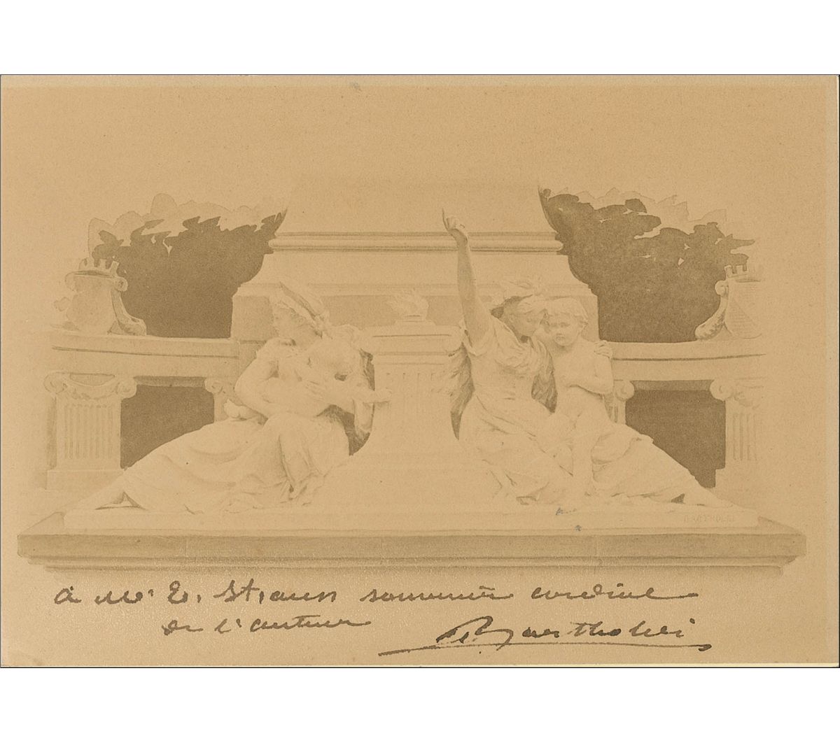 This signed photograph depicts a watercolor rendering of Bartholdi’s Monument to Leon Gambetta (1838-1882) in Sèvres, France. Bartholdi completed the monument in 1891 to memorialize Gambetta, a French statesman prominent during the Franco-Prussian War. Surmounted by a statue of Gambetta, the statues pictured represent Alsace and Lorraine taking refuge at the altar of France, below which is inscribed “Pro Patria.” A rare signed image of one of Bartholdi’s sculptures.