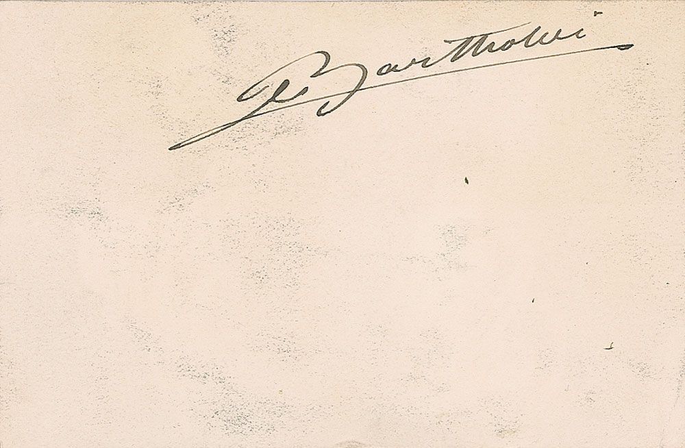 Ink signature, “Bartholdi,” on an off-white 4 x 2.5 card. In very good condition, with light scattered soiling, a couple bends to the top and bottom edges, and mounting remnants to reverse from previous display in a scrapbook.