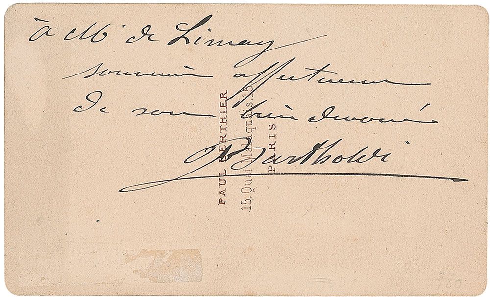 Eminent French sculptor (1834–1904) best known for designing the Statue of Liberty. Vintage 4 x 2.25 carte-de-visite photo of one of Bartholdi’s sculptures, by Paul Berthier of Paris, inscribed on the reverse in black ink in French and signed “Bartholdi.” Slight mounting remnants to reverse, as well as some mild toning, and some light spotting to background of image, otherwise fine condition.