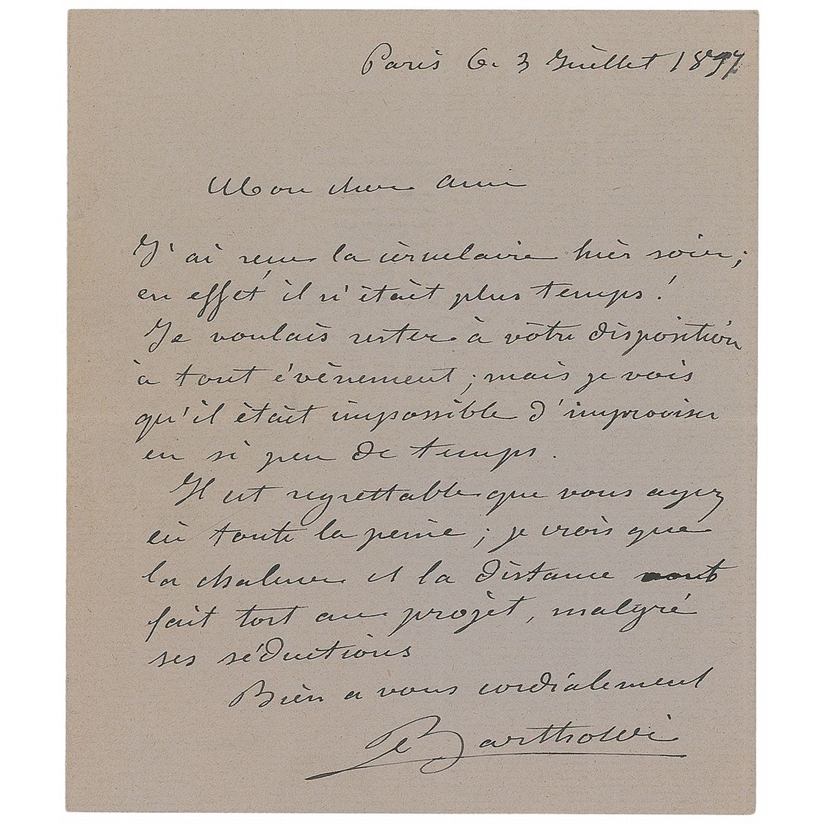 Eminent French sculptor (1834–1904) best known for designing the Statue of Liberty. Crisply penned ALS in French, signed “F. Bartholdi,” one page, 4.75 x 5.5, July 3, 1897. Letter to Mr. Goubert. In part (translated): “I received the message last night. Indeed, it was just in time! I wish I had been available to you but it was too short for any improvisation. It’s so sad but hot weather and far distance were not helpful for this project.” In fine condition.